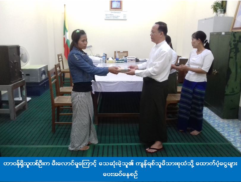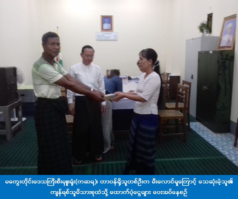 မကွေးတိုင်းတိုင်းဒေသကြီး၊ မကွေးမြို့နယ်၊ မကွေးမြို့၊ မြင်သာရပ်၊ ၂၉ လမ်း နှင့် သစ္စာလမ်းထောင့် ရွှေမြတ်မင်းသမီးအအေးခန်းစာသောက်ဆိုင်၌ (၂.၄.၂၀၁၇) ရက်နေ့(၂၂:ဝ၄) အချိန်တွင် မီးလောင်မှုကြောင့် ထောက်ပံ့ရန်ကျန်ရှိသူ (၃) ဦးအနက် သေဆုံးသူ မခေါထန်း(ခ)မပန်းရောင်နှင့် မမြသီတာ(ခ)အမုန်း (၂)ဦးတို့၏ ကျန်ရစ်သူမိသားစုထံသို့ ထောက်ပံ့ငွေ (၆၀၀၀၀၀) ကျပ်အား (၅.၄.၂၀၁၇)ရက်နေ့တွင် မကွေးမြို့နယ် အထွေထွေအုပ်ချုပ်ရေးဦးစီးဌာန အစည်းအဝေးခန်းမ၌ မကွေးတိုင်းဒေသကြီးစီးမှူးရုံး(ကဆရ)၊ တာဝန်ရှိသူတစ်ဦးက ထောက်ပံ့ပြီးဖြစ်ပါကြောင်း သိရှိရပါသည်။