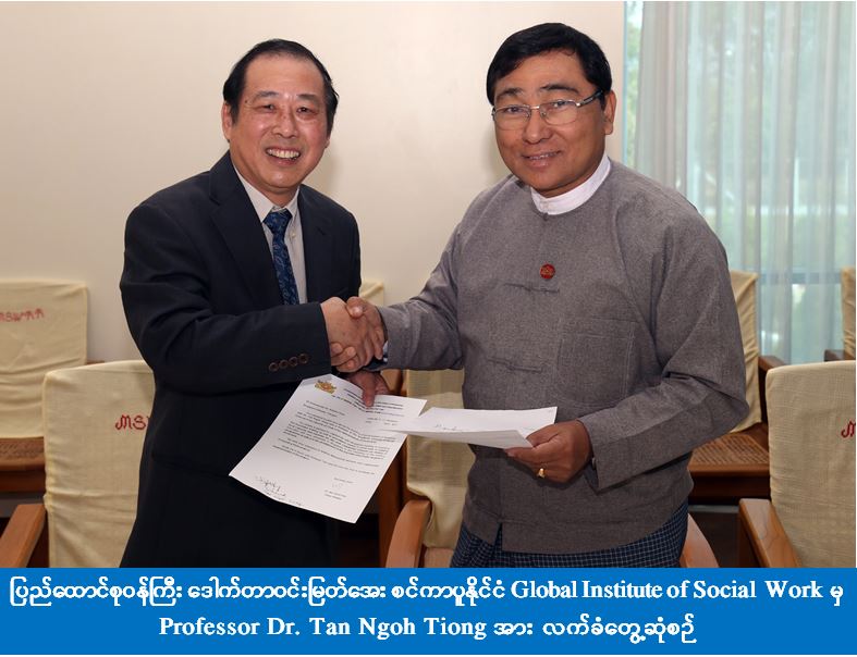 မြန်မာနိုင်ငံတွင် လူမှုရေးပညာသင်တန်းကျောင်း ထူထောင်နိုင်ရေး ကြိုတင်ပြင်ဆင်သည့်အနေဖြင့် လူ့စွမ်းအားအရင်းအမြစ် ပြုစုပျိုးထောင်ခြင်းနှင့် စွမ်းဆောင်ရည်မြှင့်တင်ခြင်းများ ဆောင်ရွက်ရန် လိုအပ်သည့်သင်တန်းများ လာရောက်ပို့ချနိုင်ရေး၊ နှစ်ဖက်ပူးပေါင်းပြီး သုတေသနလုပ်ငန်းများ ဆောင်ရွက်ရေး၊ လူမှုကျွမ်းဝင်ရင်းနှီးပေါင်းစပ်မှု (Social Cohesion) နှင့် လူမှုရေးဘာသာရပ် အထူးပြုသင်တန်းများ လာရောက်ပို့ချနိုင်ရေးအတွက် (၆-၄-၂၀၁၇) ရက်နေ့၊ နံနက်ပိုင်းက လူမှုဝန်ထမ်း၊ ကယ်ဆယ်ရေးနှင့် ပြန်လည်နေရာချထားရေးဝန်ကြီးဌာန၊ ပြည်ထောင်စုဝန်ကြီး ဒေါက်တာဝင်းမြတ်အေးနှင့် စင်ကာပူနိုင်ငံ၊ Global Institute of Social Work မှ Professor Dr. Tan Ngoh Tiong တို့သည် ဝန်ကြီးရုံး၊ မေခလာခန်းမ၌ တွေ့ဆုံဆွေးနွေးခဲ့ကြပါသည်။ ထို့နောက် လုပ်ငန်းအကောင်အထည်ဖော်ဆောင်ရွက်ရန် သဘောတူညီမှု အထိမ်းအမှတ် လက်မှတ်ရေးထိုးခြင်း ဆောင်ရွက်ခဲ့ပါသည်။