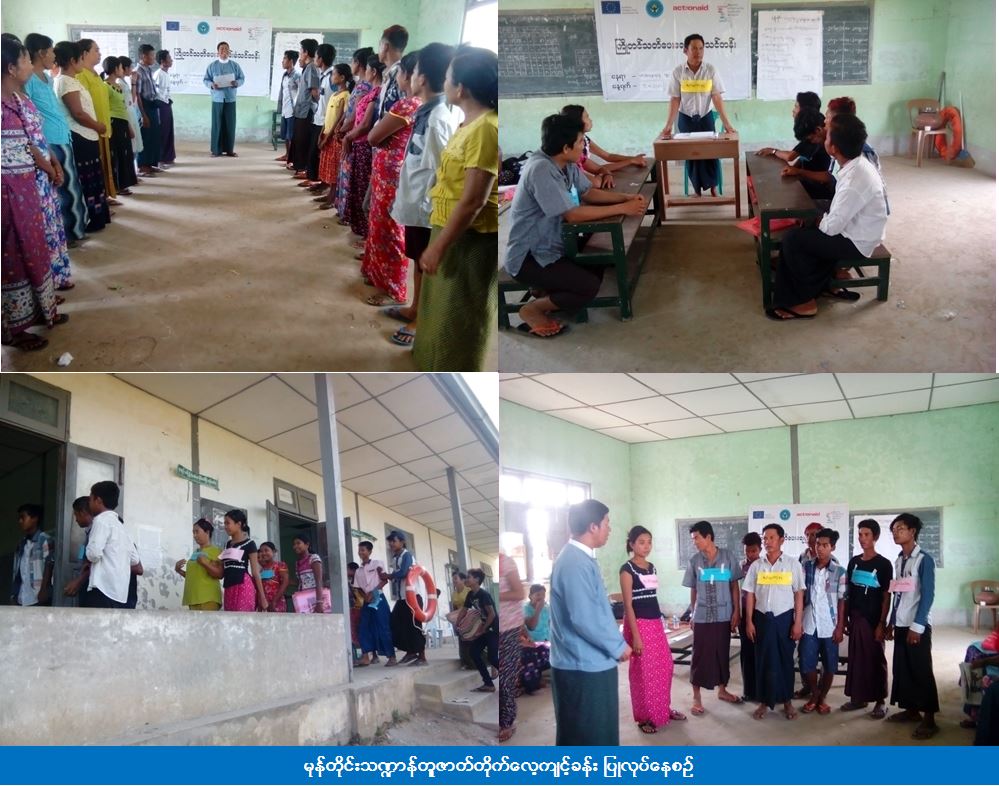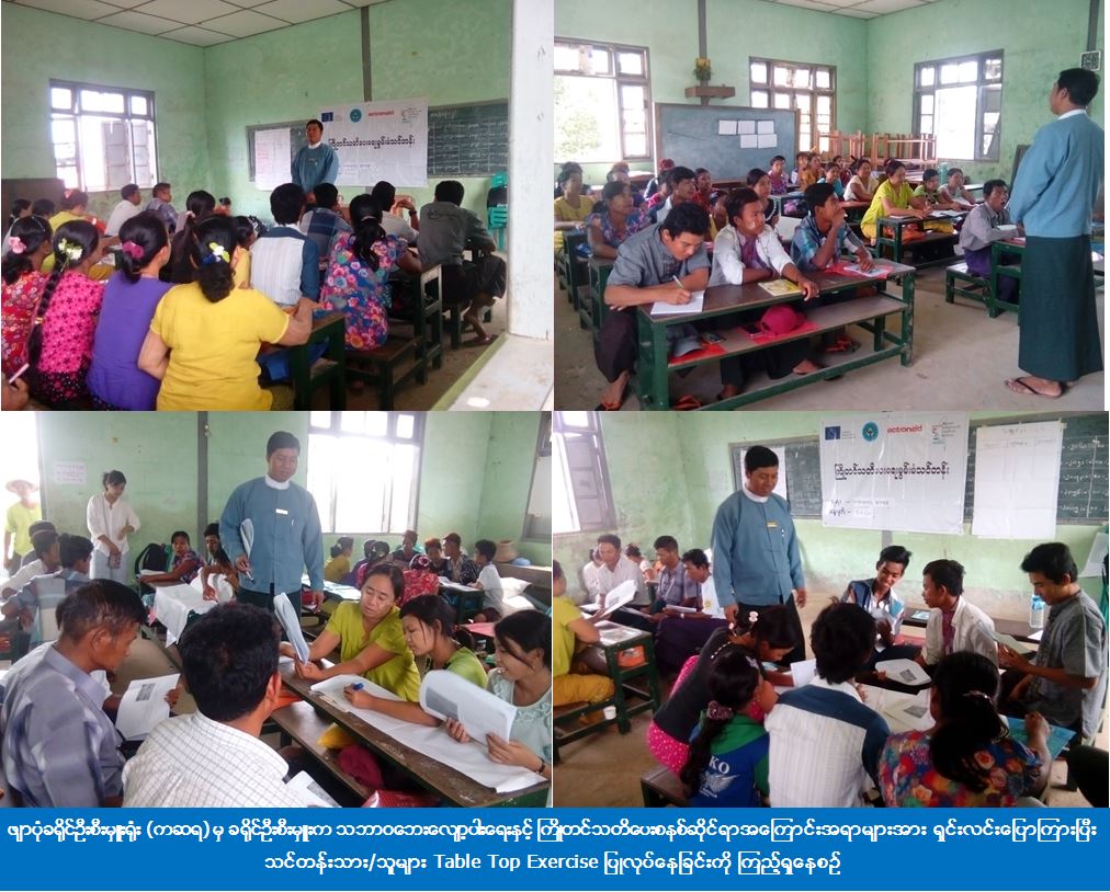 မုန်တိုင်းသဏ္ဍာန်တူဇာတ်တိုက်လေ့ကျင့်ခြင်း၊ Table Top Exercise ပြုလုပ်ခြင်းများဆောင်ရွက်ခဲ့ပြီး လက်ကမ်းစာစောင်များ၊ နံရံကပ်ပိုစတာများဝေငှပေးခဲ့ပြီးနောက် DAN Mobile Application နှင့် KOBO Collect Mobile Application ဆိုင်ရာအကြောင်းအရာများကို ရှင်းလင်းဆွေးနွေးခဲ့ကြောင်း သိရှိရပါသည်။