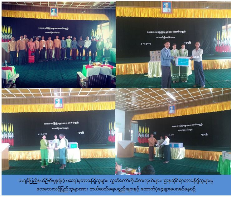 ကယ်ဆယ်ရေးနှင့်ပြန်လည်နေရာချထားရေးဦးစီးဌာန၊ ဗန်းမော်ခရိုင်ဦးစီးမှူးရုံးမှတာဝန်ရှိသူများသည် (၃-၄-၂၀၁၇) ရက်နေ့၌ ရွှေကူမြို့နယ်တွင် ဖြစ်ပွားသော လေဘေးကြောင့် အိမ်ထောင်စု (၁၉၇) စုအတွက် ကယ်ဆယ်ရေးပစ္စည်း (၄) မျိုးစီ၊ အိမ်ထောင်စု (၄) စုအတွက် ကယ်ဆယ်ရေးပစ္စည်း (၉) မျိုးစီနှင့် အိမ်ထောင်စု (၂၂၄) စုအတွက် ဆန်ဖိုးငွေ (၂၁၁၀၅၀၀ိ/-) ကျပ်၊ အိမ်ခြေ (၁၉၉) လုံးအတွက် ထောက်ပံံ့ငွေ (၁၉၉၀၀၀၀၀ိ/-) ကျပ်၊ ဘာသာရေးအဆောက်အဦး (၉) လုံးအတွက် ထောက်ပံငွေကျပ် (၉၀၀၀၀၀ိ/-) နှင့် လေဘေးကြောင့် ထိခိုက်ဒဏ်ရာရရှိသူ (၁) ဦးအတွက် ထောက်ပံ့ငွေ (၅၀၀၀၀ိ/-) ကျပ်၊ စုစုပေါင်း (၂၂၉၆၀၅၀၀ိ/-) ကျပ်တို့အား (၉-၄-၂၀၁၇) ရက်နေ့၊ နံနက်(၁၁းဝ၀) နာရီအချိန်တွင် ပြည်သူ့လွှတ်တော်ကိုယ်စားလှယ်၊ အမျိုးသားလွှတ်တော်ကိုယ်စားလှယ်၊ ပြည်နယ်လွှတ်တော်ကိုယ်စားလှယ်များ၊ ဌာနဆိုင်ရာတာဝန်ရှိသူများ၊ ပြည်နယ်ဦးစီးမှူးရုံး၊ ခရိုင်ဦးစီးမှူးရုံးမှတာဝန်ရှိသူများက ကယ်ဆယ်ရေးပစ္စည်းများနှင့် ထောက်ပံ့ငွေများအား ပြည်သူများလက်ဝယ်အရောက် ထောက်ပံ့ပေးခဲ့ကြောင်း သတင်းရရှိပါသည်။