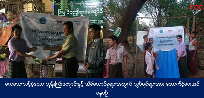 ကယ်ဆယ်ရေးနှင့် ပြန်လည်နေရာချထားရေးဦးစီးဌာန ဟင်္သာတခရိုင်ဦးစီးမှူးရုံးမှ တာဝန်ရှိသူများသည် ဟင်္သာတခရိုင်အုပ်ချုပ်ရေးမှူး၊ လေးမျက်နှာမြို့နယ်မှတာဝန်ရှိသူများ၊ လူမှုဖွံံ့ဖြိုးတိုးတက်ရေးအသင်းမှ တာဝန်ရှိသူများလိုက်ပါလျက် လေးမျက်နှာမြို့နယ်၊ ကွမ်းခြံကုန်းအုပ်စု၌ (၄-၄-၂၀၁၇) ရက်နေ့တွင် ဖြစ်ပွားခဲ့သော လေဘေးကြောင့် ကွမ်းခြံကုန်းအုပ်စုအတွင်းရှိ လေဘေးသင့်ခဲ့သော နေအိမ်များအတွက် လုံးဝပြိုကျနေအိမ်(သစ်)(၆) လုံးအတွက် (၁,၂၀၀,၀၀၀) ကျပ်၊ လုံးဝပြိုကျအိမ် (ဝါး) (၁၄) လုံးအတွက်(၁,၄၀၀,၀၀၀) ကျပ်၊ တစ်စိတ်တစ်ပိုင်းပျက်စီးအိမ် (၇၂) လုံးအတွက် (၇,၂၀၀,၀၀၀) ကျပ်၊ တစ်စိတ်တစ်ပိုင်းပျက်စီး ဘုန်းကြီးကျောင်းအတွက် (၁၀၀,၀၀၀)ကျပ်၊ စုစုပေါင်း ထောက်ပံ့ငွေ (၉,၉၀၀,၀၀၀) ကျပ်နှင့် လူမှုဖွံ့ဖြိုးတိုးတက်ရေးအသင်းမှလည်း ကွမ်းခြံကုန်းအုပ်စု ဘေးသင့်ပြည်သူများနှင့် ဘာသာရေးအဆောက်အဦများအတွက် မြောင်းသွပ် (၈ပေ-၃ပေ) (၂၁၀) ချပ်တို့အား (၇-၄-၂၀၁၇) ရက်နေ့တွင် သွားရောက်ထောက်ပံ့ပေးအပ်ခဲ့ကြောင်း သတင်းရရှိပါသည်။