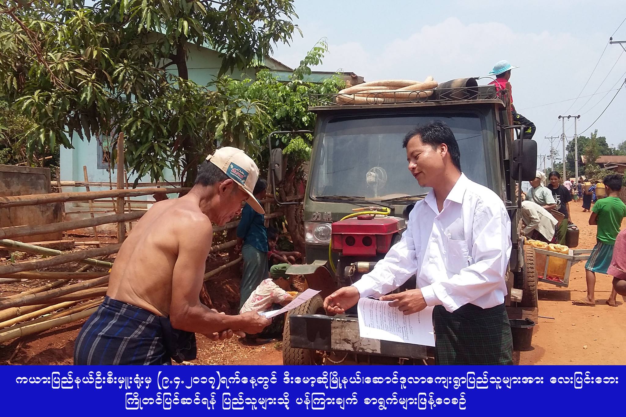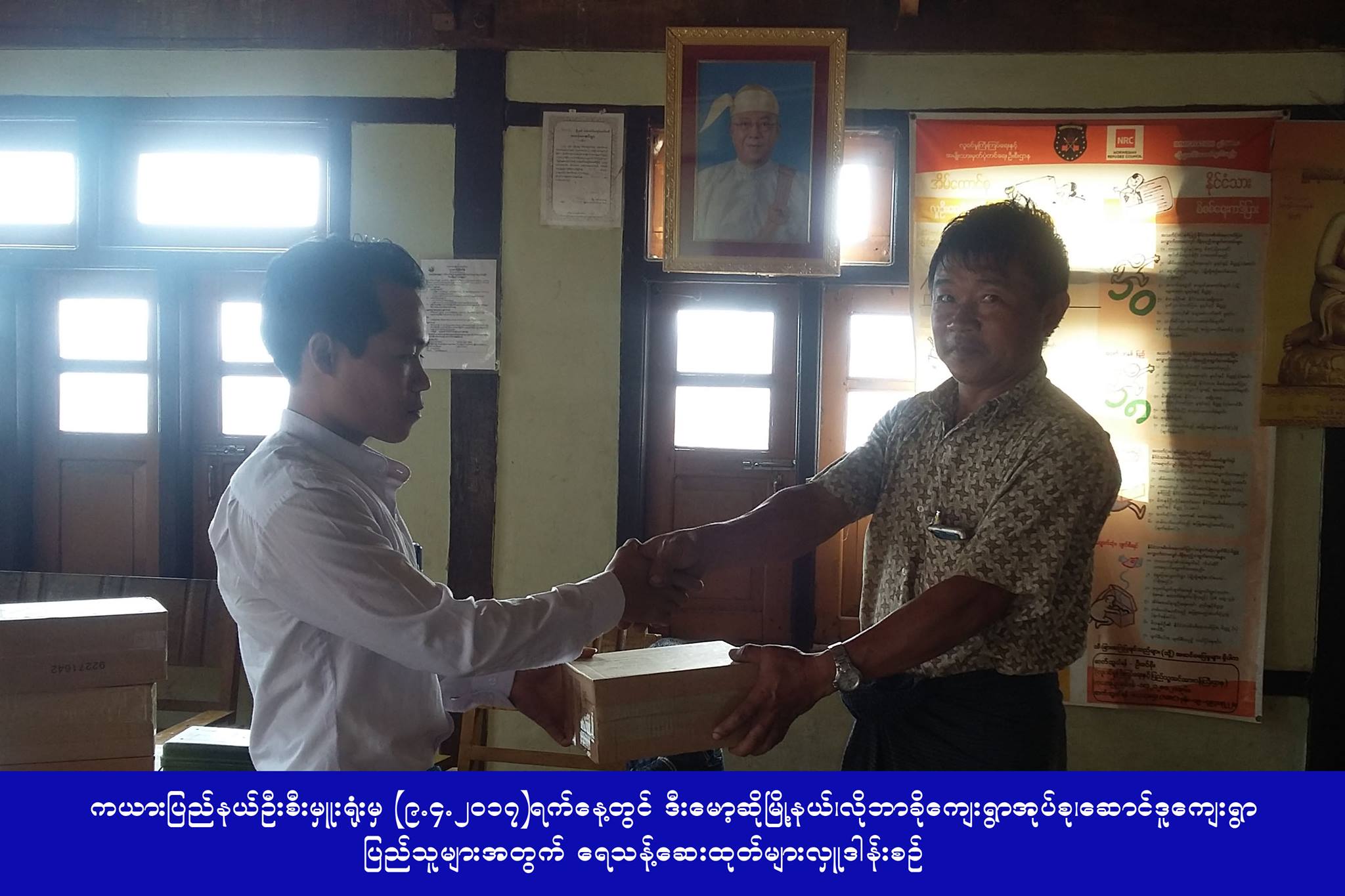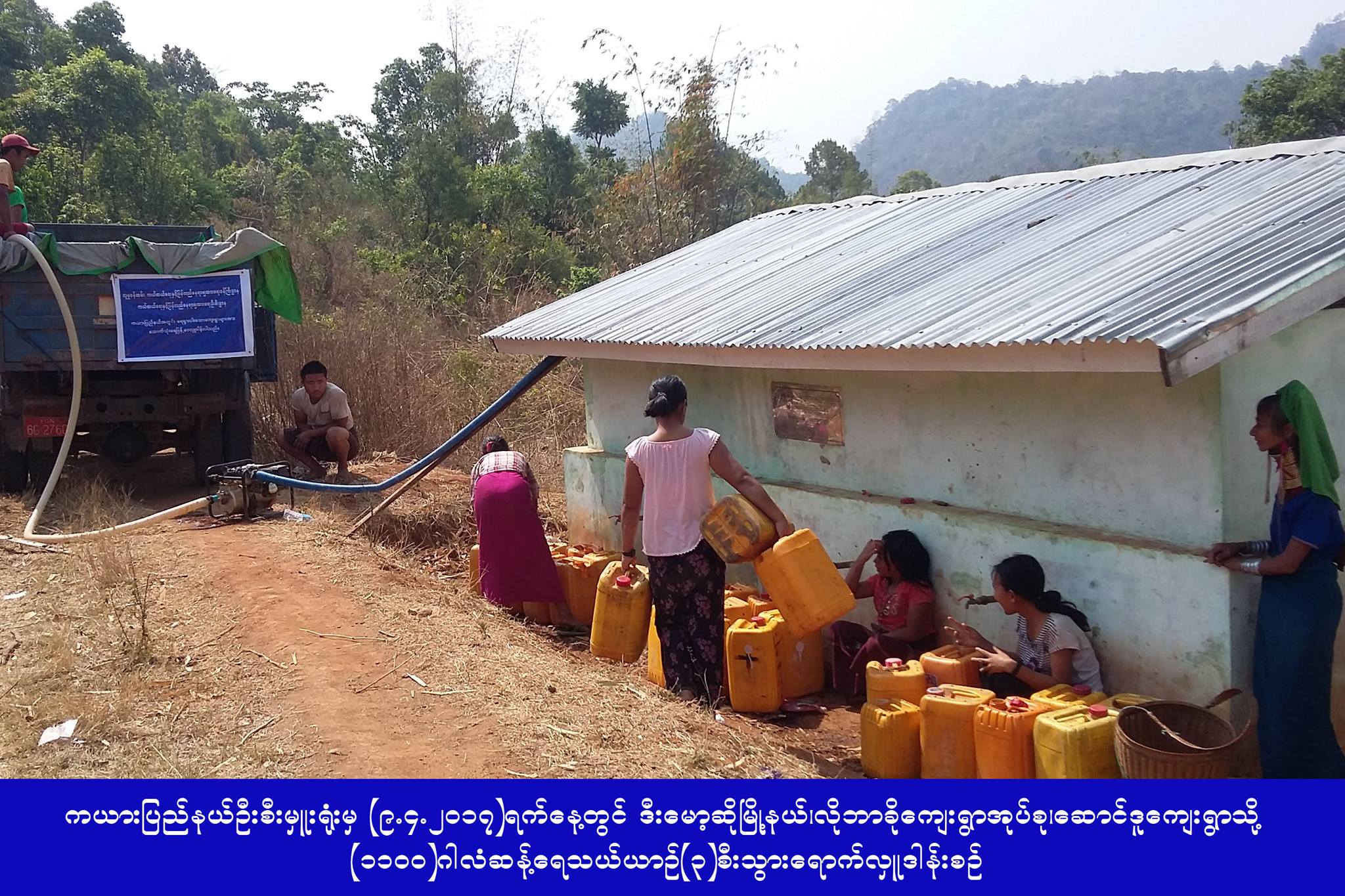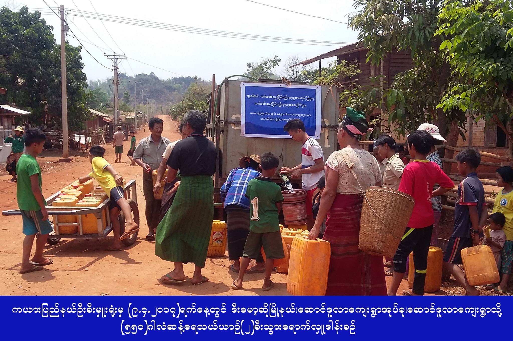 လူမှုဝန်ထမ်း၊ ကယ်ဆယ်ရေးနှင့် ပြန်လည်နေရာချထားရေးဝန်ကြီးဌာန၊ ကယ်ဆယ်ရေးနှင့် ပြန်လည်နေရာချထားရေးဦးစီးဌာန၊ ကယားပြည်နယ်ဦးစီးမှူးရုံးမှ တာဝန်ရှိသူများသည် နွေရာသီသောက်သုံးရေရှားပါးလျက်ရှိသော ဒီးမော့ဆိုမြို့နယ်၊ လိုဘာခိုကျေးရွာအုပ်စု၊ ဆောင်ဒူကျေးရွာသို့ (၁၁၀၀) ဂါလံဆန့် ရေသယ်ယာဉ် (၃) စီး၊ ဆောင်ဒူလာကျေးရွာအုပ်စု၊ ဆောင်ဒူလာကျေးရွာများသို့ (၅၅၀) ဂါလံဆန့် ရေသယ်ယာဉ် (၂) စီ၊ စုစုပေါင်းရေသယ်ယာဉ် (၅) စီးနင့် ရေသန့်ဆေးထုပ်များကို (၉-၄-၂၀၁၇) ရက်နေ့တွင် သွားရောက်ဖြန့်ဝေလှူဒါန်းခဲ့ပါသည်။ ၄င်းနောက် လေပြင်းဘေးကြိုတင်ပြင်ဆင်ရန် ပြည်သူသို ့ပန်ကြားချက်စာရွက်များ ဖြန့်ဝေပေးခဲ့ကြောင်း သိရှိရပါသည်။