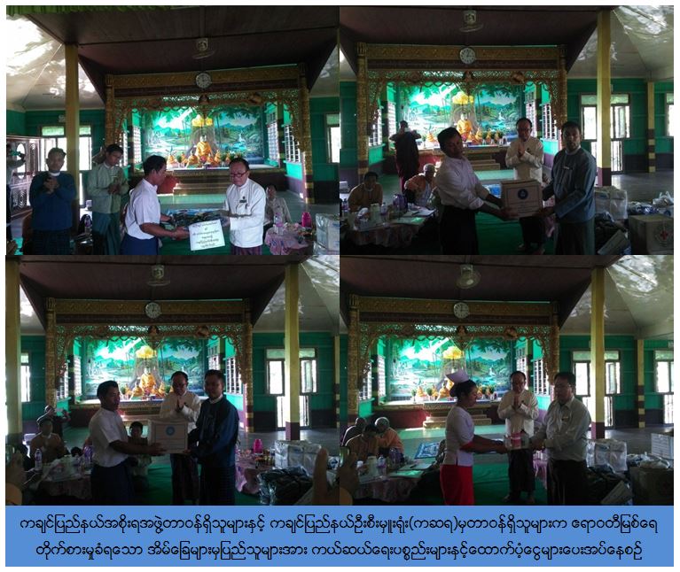 ကယ်ဆယ်ရေးနှင့်ပြန်လည်နေရာချထားရေးဦးစီးဌာန၊ ဗန်းမော်ခရိုင်ဦးစီးမှူးရုံးမှတာဝန်ရှိသူများသည် (၃-၄-၂၀၁၇) ရက်နေ့၌ ဗန်းမော်မြို့၊ ရေနီကျေးရွာတွင် ဧရာဝတီမြစ်ရေတိုက်စား ခံရမှုကြောင့် ညောင်ပင်သာကျေးရွာသို့ပြောင်းရွှေ့ရသော အိမ်ထောင်စု (၁၇၃) စု၊ အိမ်ခြေ (၁၄၈) လုံး အတွက် ကယ်ဆယ်ရေးပစ္စည်း (၄) မျိုး၊ ဆန်ဖိုးငွေ (၁၈၉၀၀၀၀ိ/-) ကျပ်၊ အိမ်ဆောက်ပစ္စည်းဖိုးထောက်ပံ့ငွေ (၁၄၈၀၀၀၀၀ိ/-)ကျပ်နှင့် ကံသာကျေးရွာရှိအိမ်ထောင်စု(၇၇) စု၊ အိမ်ခြေ (၇၇) လုံးတို့တွင် အိမ်ထောင်စု (၃၂) စုအတွက် ကယ်ဆယ်ရေးပစ္စည်း (၄) မျိုးနှင့် ဆန်ဖိုးငွေ (၄၂၆၃၀၀ိ/-) ကျပ်၊ အိမ်ဆောက်ပစ္စည်းဖိုးငွေ (၇၇၀၀၀၀၀ိ/-) ကျပ်တို့အား ဗန်းမော်မြို့နယ် ရေနီကျေးရွာ(သာသနာ့ဓမ္မမာမက)ကျောင်းတိုက်တွင် (၈-၄-၂၀၁၇)ရက်နေ့၌ ကချင်ပြည်နယ်လူမှုရေးဝန်ကြီးဒေါက်တာသင်းလွင်၊ ကချင်ပြည်နယ်လွှတ်တော်ဥက္ကဌ ဦးထွန်းတင်၊ ကချင်ပြည်နယ်ဦးစီးမှူးရုံး(ကဆရ)နှင့် ဗန်းမော်ခရိုင်ဦးစီးမှူးရုံး(ကဆရ)မှတာဝန်ရှိသူများမှ ပြည်သူများလက်ဝယ်အရောက် သွားရောက်ထောက်ပံ့ပေးခဲ့ကြောင်း သတင်းရရှိပါသည်။