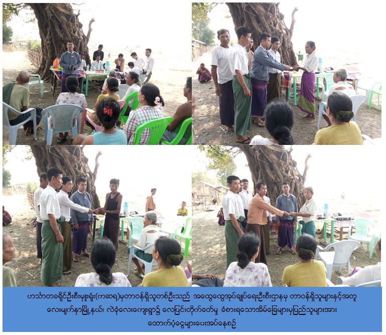 ကယ်ဆယ်ရေးနှင့်ပြန်လည်နေရာချထားရေးဦစီးဌာန၊ ဟင်္သာတခရိုင်ဦးစီးမှူးရုံးမှ တာဝန်ရှိသူများသည် (၅-၄-၂၀၁၇) ရက်နေ့တွင်လေးမျက်နှာမြို့နယ်၊ ဝက်ကုန်းအုပ်စု၊ လဲခုံလေးကျေးရွာ၌ ဖြစ်ပွားသောလေပြင်းတိုက်ခတ်မှုကြောင့် လုံးဝပြိုလဲ ၀ါးအိမ် (၂) လုံး၊ တစ်စိတ်တစ်ပိုင်းပျက်စီးအိမ် (၈) လုံးတို့အတွက် အိမ်ဆောက်ပစ္စည်းဖိုးထောက်ပံ့ငွေ စုစုပေါင်း(၁၀၀၀၀၀၀ိ/-)ကျပ်/ (ဆယ်သိန်းကျပ်)တိတိကို လေးမျက်နှာမြို့ အထွေထွေအုပ်ချုပ်ရေးဦးစီးဌာနမှ တာဝန်ရှိသူများနှင့်အတူ (၁၀-၄-၂၀၁၇)ရက်နေ့တွင် လေဘေးသင့်ပြည်သူများလက်ဝယ်အရောက် သွားရောက်ထောက်ပံ့ပေးခဲ့ကြောင်း သတင်းရရှိပါသည်။