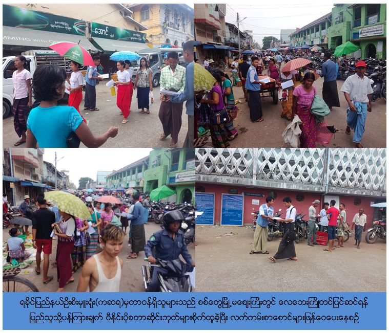 ကယ်ဆယ်ရေးနှင့်ပြန်လည်နေရာချထားရေးဦးစီးဌာန၊ ရခိုင်ပြည်နယ်ဦးစီးမှူးရုံးမှတာဝန်ရှိသူများသည် (၁၁-၄-၂၀၁၇)ရက်နေ့ နံနက်(၁ဝးဝ၀)နာရီအချိန်တွင် စစ်တွေမြို့မစျေးကြီးတွင် လေပြင်းဘေး ကြိုတင်ပြင်ဆင်ရန် ပြည်သူသို့ပန်ကြားချက် ဗီနိုင်းပိုစတာများစိုက်ထူခဲ့ပြီး လက်ကမ်းစာစောင်များ ဖြန့်ဝေပေးခဲ့ကြောင်း သတင်းရရှိပါသည်။