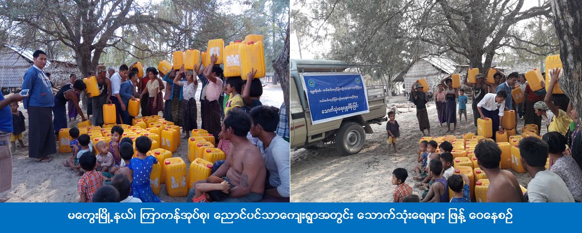 ကယ်ဆယ်ရေးနှင့် ပြန်လည်နေရာချထားရေးဦးစီးဌာန၊ မကွေးတိုင်းဒေသကြီးဦးစီးမှူးရုံးမှ တာဝန်ရှိသူများသည် (၁၃-၄-၂၀၁၇) ရက်နေ့၊ နံနက် (၉းဝ၀) နာရီတွင် မကွေးမြို့နယ်၊ ကြာကန်အုပ်စု၊ ညောင်ပင်သာကျေးရွာရှိ ညောင်ပင်ချောင် တဲတိုက်၊ အုန်းပင်ချောင် တဲတိုက်၊ ကန်နှစ်ဆင့် တဲတိုက်တို့ရှိ ပြည်သူများအတွက် သောက်သုံးရေဂါလံ (၇၂၀၀) အား သွားရောက်လှူဒါန်းခဲ့ကြောင်း သိရှိရပါသည်။