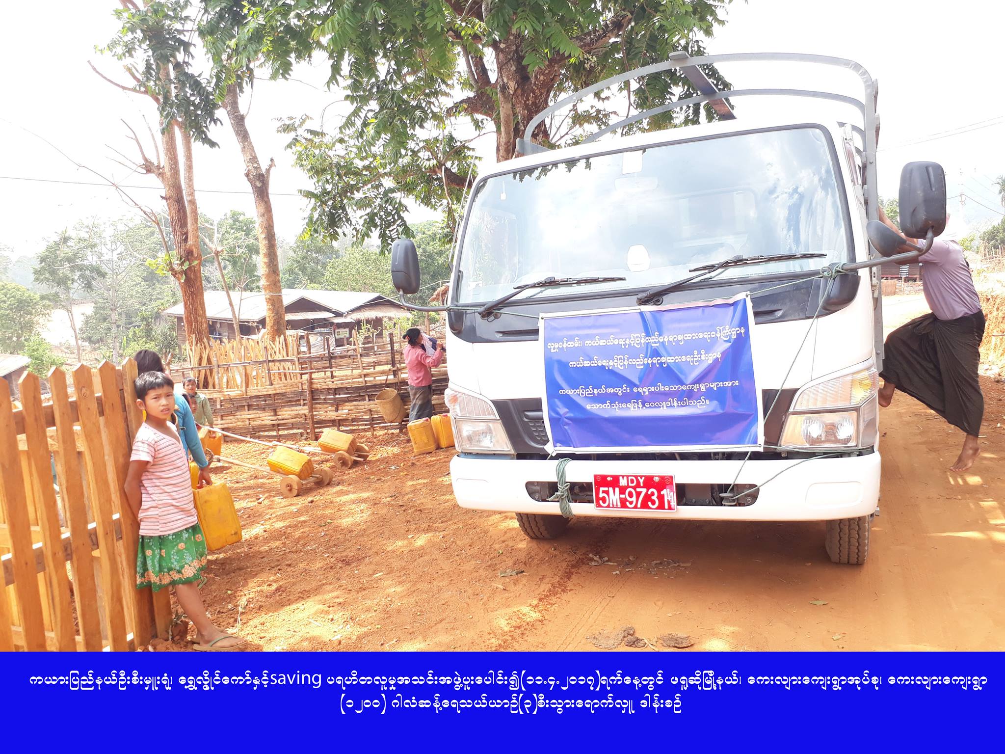 လူမှု၀န်ထမ်း၊ ကယ်ဆယ်ရေးနှင့် ပြန်လည်နေရာချထားရေး၀န်ကြီးဌာန၊ ကယ်ဆယ်ရေးနှင့် ပြန်လည်နေရာချထားရေးဦးစီးဌာန၊ ကယားပြည်နယ်ဦးစီးမှူးရုံးသည် ရွှေလွိုင်ကော်နှင့် Saving ပရဟိတလူမှုအသင်းအဖွဲ့များနှင့်ပူးပေါင်း၍ နွေရာသီသောက်သုံးရေရှားပါးလျက်ရှိသော ဖရူဆိုမြို့နယ်၊ ကေးလျားကျေးရွာအုပ်စု၊ ကျေးလျားကျေးရွာသို့ (၁၂၀၀) ဂါလံဆန့် ရေသယ်ယာဉ်တစ်စီးစီ၊ စုစုပေါင်းရေသယ်ယာဉ် (၃) စီးကို (၁၁-၄-၂၀၁၇) ရက်နေ့တွင် သွားရောက်ဖြန့်ဝေလှူဒါန်းခဲ့ကြောင်း သိရှိရပါသည်။