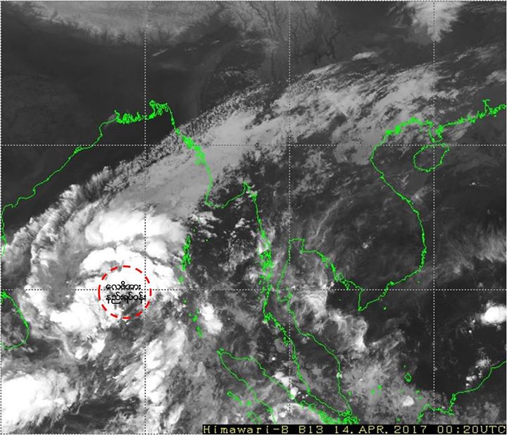 ဘင်္ဂလားပင်လယ်အော်အရှေ့တောင်ပိုင်းတွင် ဖြစ်ပေါ်နေသော လေဖိအားနည်းရပ်ဝန်းသည် နောက် (၄၈) နာရီ အတွင်း ပိုမိုအားကောင်းလာကာ မုန်တိုင်းငယ် (Depression) တစ်ခုအဖြစ်သို့ ရောက်ရှိနိုင်မှုသတင်း (မိုးလေဝသနှင့် ဇလဗေဒညွှန်ကြားမှုဦးစီးဌာနမှ ၂၀၁၇ ခုနှစ်၊ ဧပြီလ (၁၄) ရက်နေ့ မြန်မာစံတော်ချိန် (၀၇:၀၀) နာရီအချိန်ထုတ်ပြန်ချက်)