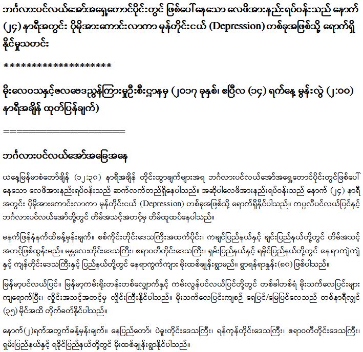 ဘင်္ဂလားပင်လယ်အော်အရှေ့တောင်ပိုင်းတွင် ဖြစ်ပေါ်နေသော လေဖိအားနည်းရပ်ဝန်းသည် နောက် (၂၄) နာရီအတွင်း ပိုမိုအားကောင်းလာကာ မုန်တိုင်းငယ် (Depression) တစ်ခုအဖြစ်သို့ ရောက်ရှိ နိုင်မှုသတင်းမိုးလေဝသနှင့်ဇလဗေဒညွန်ကြားမှုဦးစီးဌာနမှ (၂၀၁၇ ခုနှစ်၊ ဧပြီလ (၁၄) ရက်နေ့ မွန်းလွဲ (၂:၀၀) နာရီအချိန် ထုတ်ပြန်ချက်)