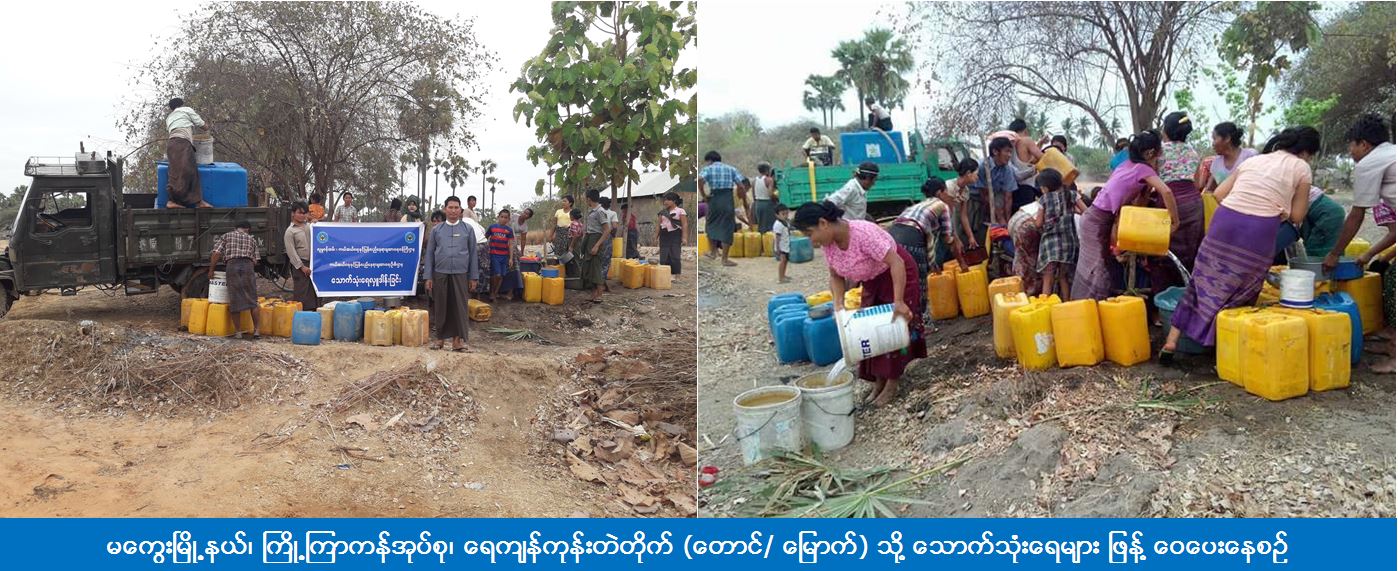 (၁၅-၄-၂၀၁၇) ရက်နေ့၊ (၁၂းဝ၀) နာရီအချိန်တွင် မကွေးတိုင်းဒေသကြီးဦးစီးမှူးရုံး (ကဆရ) မှ တိုင်းဒေသကြီးဦးစီးမှူးနှင့် တာဝန်ရှိသူများသည် မကွေးမြို့နယ်၊ ကြို့ကြာကန်အုပ်စု၊ ရေကျန်ကုန်းတဲတိုက် (တောင်/ မြောက်) ရှိ အိမ်ခြေ (၁၄၀) မှ လူဦးရေ (၇၀၀) အတွက် သောက်သုံးရေဂါလံ (၁၁၀၀၀) အား သွားရောက်ဖြန့်ဝေပေးခဲ့ကြောင်း သိရှိရပါသည်။