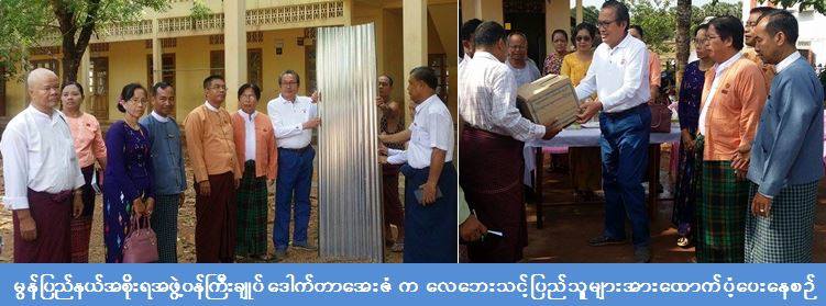 -မွန်ပြည်နယ်၊ ကျိုက်မရောမြို့နယ်၊ သံကလောင်ကျေးရွာနှင့် လက်ပန်ကျေးရွာတို့တွင် နေအိမ် (၁၉)လုံး၊ (အထက)ကျောင်း(၁)ကျောင်း၊ ကျေးရွာမူကြိုကျောင်း(၁)ကျောင်းတို့ အမိုးလန် ပျက်စီးခဲ့ပြီး လမ်းမီးတိုင်(၂၉)တိုင်ပျက်စီးခဲ့ရာ မွန်ပြည်နယ်၀န်ကြီးချုပ်နှင့်အတူ လူမှု၀န်ထမ်း၊ ကယ်ဆယ်ရေးနှင့်ပြန်လည်နေရာချထားရေး၀န်ကြီးဌာန၊ ကယ်ဆယ်ရေးနှင့် ပြန်လည်နေရာချ ထားရေးဦးစီးဌာန၊ မွန်ပြည်နယ်ဦးစီးမှူးသည် (၁၅-၄-၂၀၁၇)နေ့တွင် ဘေးဖြစ်ကျေးရွာများသို့ သွားရောက်ကာ နေအိမ်(၁၉)လုံးအတွက် ကယ်ဆယ်ရေးပစ္စည်း (၄)မျိုးစီနှင့် အမိုးသွပ် (၂၉၇)ချပ်တို့အားလည်းကောင်း၊ (အထက)ကျောင်းအတွက် အမိုးသွပ် (၂၀)ချပ်နှင့် ကျေးရွာ မူကြိုကျောင်းအတွက် အမိုးသွပ်(၇)ချပ်တို့အားလည်းကောင်း ဘေးသင့်ပြည်သူများထံသို့ သွားရောက်ထောက်ပံ့ပေးခဲ့ပါသည်။