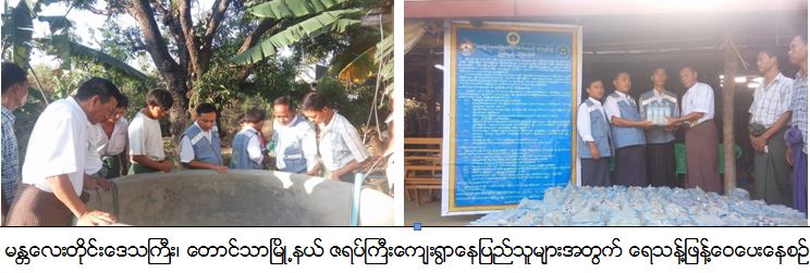 လူမှုဝန်ထမ်း၊ကယ်ဆယ်ရေးနှင့်ပြန်လည်နေရာချထားရေးဝန်ကြီးဌာန၊ ကယ်ဆယ်ရေးနှင့်ပြန်လည် နေရာချထားရေးဦးစီးဌာန၊ မန္တလေးတိုင်းဒေသကြီးဦးစီးမှူးရုံးမှ တာဝန်ရှိသူများသည် (၁၈-၄-၁၇) ရက်နေ့တွင် သောက်သုံးရေဖူလုံမှုမရှိသော တောင်သာမြို့နယ် ဇရပ်ကြီးကျေးရွာသို့ ကွင်းဆင်းလျက် ရေသန့်ဘူး ၈ လုံးပါ ၂၀၀ ကဒ် အားထောက်ပ့ံပေးခဲ့ပြီး၊ ရွာ၏ရေချိုထွက်ရှိရာ ရေတွင်းနေရာကို ကြည့်ရှု့ပြီး ရေရှည်သောက်သုံးရေဖူလုံရေး ညှိနှိုင်းဆောင်ရွက်ခဲ့ဲ့ကြောင်းနှင့် လေပြင်းဘေးကြိုတင် ကာကွယ်ရေးပညာပေး ဗွီနိုင်းပိုစတာလည်းချိတ်ဆွဲဲခဲ့ကြောင်း သတင်းရရှိပါသည်။