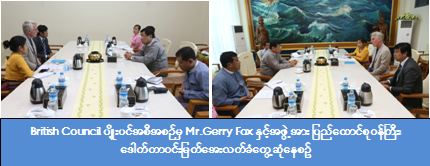လူမှုဝန်ထမ်း၊ ကယ်ဆယ်ရေးနှင့် ပြန်လည်နေရာချထားရေးဝန်ကြီးဌာန၊ ပြည်ထောင်စုဝန်ကြီး ဒေါက်တာဝင်းမြတ်အေးသည် British Council ပျိုးပင်အစီအစဉ်(Pyoe Pin Programme)၏ အဖွဲ့ ခေါင်းဆောင်ဖြစ်သူ Mr. Gerry Fox ဦးဆောင်သောကိုယ်စားလှယ်အဖွဲ့အားဝန်ကြီးရုံးမေခလာခန်းမတွင် ယမန်နေ့ နံနက်(၁၀:၀၀)နာရီကလက်ခံတွေ့ဆုံခဲ့ပါသည်။