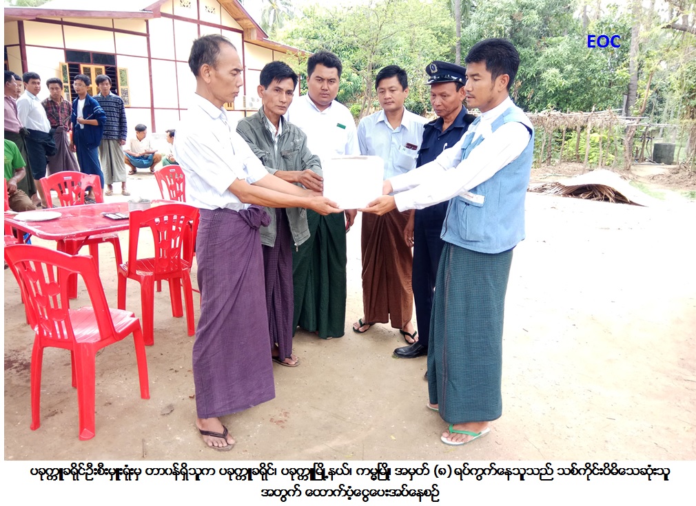 မကွေးတိုင်းဒေသကြီး၊ ပခုက္ကူခရိုင်၊ ပခုက္ကူမြို့၊ အမှတ် (၁၃) ရပ်ကွက်တွင် (၂၂-၄-၂၀၁၇) ရက်နေ့ ညနေပိုင်း၌ လေပြင်းတိုက်ခတ်မှုကြောင့် လေဘေးသင့်အိမ်ထောင်စု (၁) စု၊ ဘေးသင့်လူဦးရေ (၅) ဦးအား အိမ်ဆောက်ပစ္စည်းဖိုး (၄၀၀၀၀ိ/) ကျပ်၊ ဆန်ရိက္ခာဖိုး (၁၀၅၀၀)ကျပ်၊ ကယ်ဆယ်ရေးပစ္စည်း (၄)မျိုးတို့အားလည်းကောင်း၊ အဆိုပါလေပြင်းတိုက်ခတ်မှု ကြောင့် ပခုက္ကူခရိုင်၊ ပခုက္ကူမြို့နယ်၊ ကမ္မမြို့၊ အမှတ် (၈) ရပ်ကွက်နေသူသည် သစ်ကိုင်းပိမိသေဆုံးမှုကြောင့် သေဆုံးထောက်ပံ့ငွေ (၃၀၀၀၀၀ိ/) ကျပ်အားလည်းကောင်း၊ (၁၂-၄-၂၀၁၇) ရက်နေ့ ကမ္မမြို့၊ အမှတ် (၃) ရပ်ကွက်တွင် မီးလောင်ကျွမ်းမှုအား ဝိုင်းဝန်းငြိမ်းသတ်ရာမှ ထိခိုက်ဒဏ်ရာရရှိခဲ့သူအား ဆေးရုံတက်ထောက်ပံ့ငွေ (၅၀၀၀၀) ကျပ်အားလည်းကောင်း ဌာနဆိုင်ရာများ၊ ရပ်ကွက် အုပ်ချုပ်ရေးမှူးများနှင့်အတူ ကယ်ဆယ်ရေးနှင့်ပြန်လည်နေရာချထားရေးဦးစီးဌာန၊ ပခုက္ကူခရိုင်ဦးစီးမှူးရုံးမှ တာဝန်ရှိသူများက ဘေးသင့်ပြည်သူများ၏ လက်ဝယ်အရောက်ထောက်ပံ့ပေး အပ်ခဲ့ကြောင်း သတင်းရရှိပါသည်။