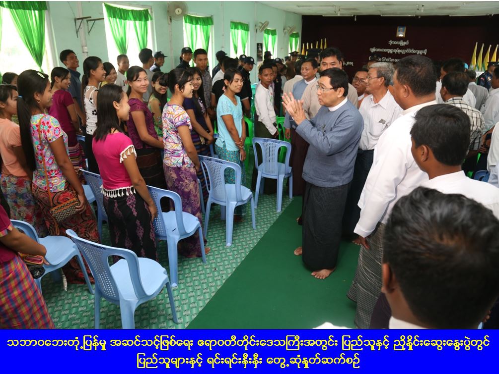 ၁။ သဘာဝဘေးကြိုတင်ကာကွယ်ရေးလုပ်ငန်းများနှင့် သဘာဝဘေး ရင်ဆိုင်တုံ့ပြန်ရန် အဆင်သင့်ဖြစ်ရေး ဧရာဝတီတိုင်းဒေသကြီးတွင် ရပ်ကွက်/ကျေးရွာများ၌ ပြည်သူများနှင့် ထိတွေ့ဆောင်ရွက်လျက်ရှိသော အမျိုးသားသဘာဝဘေးအန္တရာယ်ဆိုင်ရာ စီမံခန့်ခွဲမှု ကော်မတီ၊ ဒုတိယဥက္ကဌ၊ လူမှုဝန်ထမ်း၊ ကယ်ဆယ်ရေးနှင့် ပြန်လည်နေရာချထားရေး ၀န်ကြီးဌာန၊ ပြည်ထောင်စုဝန်ကြီး ဒေါက်တာဝင်းမြတ်အေးသည် (၂၃-၄-၂၀၁၇)ရက်နေ့ နံနက်ပိုင်း၌ ဖျာပုံခရိုင်၊ ဘိုကလေးမြို့နှင့် ဖျာပုံမြို့နယ်၊ ကျုံကန်ကျေးရွာတို့တွင် ရပ်ကွက်ကျေးရွာရှိ ပြည်သူလူထုနှင့် တွေ့ဆုံရာတွင် ပညာရှင်များ၏လေ့လာဆန်းစစ်ချက် များအရ ကမ္ဘာ့နိုင်ငံ (၁၇၁) နိုင်ငံတွင် သဘာဝ ဘေးဖြစ်ပွားမှု၌ မြန်မာနိုင်ငံသည် ဖြစ်ပွားအများဆုံးအလိုက် အဆင့်(၄၂)တွင်ရှိပြီး သဘာဝ ဘေးရင်ဆိုင်တုံ့ပြန်ရန် အဆင်သင့်ဖြစ်မှုတွင် အဆင့်သင့်မဖြစ်ခြင်းအဆင့်(၁၅)တွင် ရှိပါကြောင်း၊ ယေဘုယျအားဖြင့်ဆိုရသော် သဘာဝဘေးဖြစ်ပွားမှုများပြားပြီး ရင်ဆိုင် တုံ့ပြန်နိုင်ရန် အဆင်သင့်ဖြစ်မှု လိုအပ်နေသည်မှာ ထင်ရှားပါကြောင်း၊ ၄င်းအခြေအနေများသည် နိုင်ငံတစ်နိုင်ငံ၏ လမ်းတံတားအဆောက်အဦများ ကြံ့ခိုင်မှုအခြေအနေ၊ ကုန်းလမ်း၊ ရေလမ်း၊ လေလမ်း၊ ပို့ဆောင်မှု၊ လုံခြုံမှုမရှိခြင်းနှင့် ဆက်သွယ်ရေးစနစ်လိုအပ်မှုများ၊ လျှပ်စစ်စွမ်းအင်သုံးစွဲမှု မလုံလောက်ခြင်းစသည့် အချက်များပေါ်တွင် မူတည်သည်ကို လေ့လာ တွေ့ရှိရပါကြောင်းနှင့် သဘာဝဘေးကို ရင်ဆိုင်တုံ့ပြန်နိုင်ရန် အဆင်သင့်ဖြစ်ရေးဆောင်ရွက်ရာတွင် အစိုးရအဖွဲ့သစ်အနေဖြင့် အဓိကကျသော လမ်းတံတားကြံ့ခိုင်ရေး၊ ပို့ဆောင်မှုများကောင်းမွန်ရေး၊ ဆက်သွယ်မှုများတိုးတက်ရေးနှင့် လျှပ်စစ်စွမ်းအင်ပိုမိုအသုံးချနိုင်ရေးကို ကြိုးစားဆောင်ရွက်လျက်ရှိပါကြောင်း၊ မိမိတို့ဝန်ကြီး ဌာနအနေဖြင့် သဘာဝဘေးနှင့် ပတ်သက်၍ ကြိုတင်ပြင်ဆင်မှုအပိုင်းကို အဓိကထား ဆောင်ရွက်လျက်ရှိရာ လိုအပ်သော နေရာတိုင်းတွင် လုံခြုံစိတ်ချရသော အရေးပေါ် ခိုလုံရာ ဘက်စုံသုံးအဆောက်အဦများကို ဖြည့်ဆည်းတည်ဆောက်နိုင်ရေး၊ အလျင်အမြန် ထိရောက်သော တုံ့ပြန်မှုပြုနိုင်ရန် ဘေးအန္တရာယ်ပူးပေါင်းကူညီရေးတပ်ဖွဲ့ကို အရန်မီးသတ် တပ်ဖွဲ့ဝင်များ၊ ကြက်ခြေနီတပ်ဖွဲ့ဝင်များ၊ လူမှုရေးအဖွဲ့အစည်းများမှ စေတနာ့ဝန်ထမ်းများ၊ မြန်မာနိုင်ငံရဲတပ်ဖွဲ့ဝင်များနှင့် ပူးပေါင်းဖွဲ့စည်းပြီး တပ်မတော်၊ တပ်ရင်း/တပ်ဖွဲ့များနှင့် ပူးပေါင်းကာ သဘာဝဘေးတုံ့ပြန်ရန် အဆင်သင့်ဖြစ်ရေး ကြိုးပမ်းလျက်ရှိပါကြောင်း၊ ထိုကဲ့သို့အဆင်သင့်ဖြစ်ရေး အကောင်အထည်ဖော်ရာတွင် ပြည်သူ၏ ပူးပေါင်းပါ၀င်မှုသည် အရေးကြီးပါကြောင်း ပြည်သူနှင့်အတ