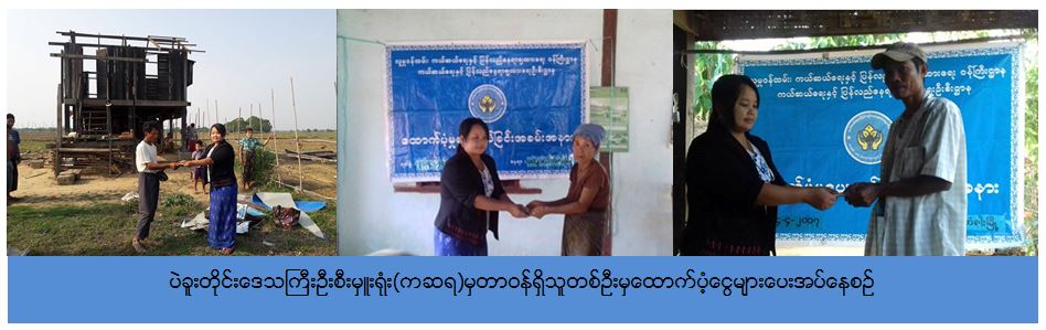 ကယ်ဆယ်ရေးနှင့်ပြန်လည်နေရာချထားရေးဦးစီးဌာန၊ ပဲခူးတိုင်းဒေသကြီးဦးစီးမှူးရုံးမှတာဝန်ရှိသူများသည် (၂၂-၄-၂၀၁၇)ရက်နေ့တွင် ကျောက်တံခါးမြို့နယ်၊ ကြာအင်းကုန်းကျေးရွာအုပ်စု သာယာကုန်းကျေးရွာ၊ မီးချောင်းအိုင်ကျေးရွာ၊ ဆင်ဇလုပ်ကျေးရွာအုပ်စု သရက်စိန်ကျေးရွာ၊ ကင်မွန်းအင်းကျေးရွာအုပ်စု ကျီအင်းကျေးရွာနှင့် သပြေတန်းကျေးရွာတို့တွင် လေပြင်းတိုက်ခတ်မှုခံရသော နေအိမ် (၃၁) လုံး အတွက် ထောက်ပံ့ငွေ (၁၄,၀၀,၀၀၀ိ/-)ကျပ်တိတိ ကို (၂၄-၄-၂၀၁၇) ရက်နေ့တွင် သွားရောက်ထောက်ပံ့ပေးခဲ့ကြောင်း သတင်းရရှိပါသည်။
