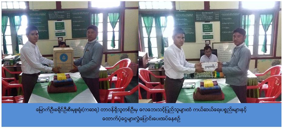 ကယ်ဆယ်ရေးနှင့်ပြန်လည်နေရာချထားရေးဦးစီးဌာန၊ မြောက်ဦးခရိုင်ဦးစီးမှူးရုံးမှတာဝန်ရှိသူများသည် (၂၄-၄-၂၀၁၇)ရက်နေ့တွင် ကျောက်တော်မြို့နယ်၊ ကျင်းကြီးကျေးရွာအုပ်စု လင်းကွိကျေးရွာတွင် လေပြင်းတိုက်ခတ်မှုကြောင့် သွပ်မိုး ၀ါးထရံကာ ပျဉ်ခင်း လူနေအိမ် (၅) လုံး အမိုးလန်ထရံပျက်စီးခဲ့ပြီး မာလာကျေးရွာအုပ်စု ခပေါ်ကျေးရွာတွင် သွပ်မိုးဝါးထရံကာ ၀ါးခင်းလူနေအိမ် (၁) လုံး သစ်ပင်ပိပြိုကျပျက်စီး ခဲ့ပါသည်။ အမိုးလန်ထရံပျက်စီး အိမ်ခြေ (၅) လုံးမှ အိမ်ထောင်စု (၅) စုအား ကယ်ဆယ်ရေးပစ္စည်း (၄) မျိုးစီ၊ သစ်ပင်ပိ အိမ်ထောင်စု (၁) စုအား ကယ်ဆယ်ရေးပစ္စည်း (၉) မျိုးနှင့် အိမ်ထောင်စု (၆) စုမှ လူဦးရေ (၃၀) ဦးအတွက် ဆန်ရိက္ခာ (၇)ရက်စာဖိုး ထောက်ပံ့ငွေ (၆၃,၀၀၀ိ/-)ကျပ်၊ အမိုးလန်ထရံပျက်စီး အိမ်ခြေ (၅) လုံးအတွက် အိမ်ဆောက်ပစ္စည်းဖိုး (၂၅၀,၀၀၀ိ/-)ကျပ်နှင့် သစ်ပင်ပိအိမ်ခြေ (၁) လုံး အတွက်ထောက်ပံ့ငွေ (၁၀၀,၀၀၀ိ/)ကျပ၊် စုစုပေါင်း ( ၄၁၃,၀၀၀ိ/-)ကျပ် တို့အား (၂၅-၄-၂၀၁၇)ရက်နေ့တွင် ကျောက်တော်မြို့နယ်အထွေထွေအုပ်ချုပ်ရေးမှူးရုံးသို့ လွှဲပြောင်းထောက်ပံ့ပေးခဲ့ပါသည်။