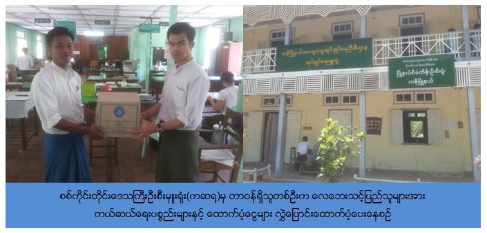 ကယ်ဆယ်ရေးနှင့်ပြန်လည်နေရာချထားရေးဦးစီးဌာန၊ စစ်ကိုင်းတိုင်းဒေသကြီးဦးစီးမှူးရုံးမှတာဝန်ရှိသူများသည် (၂၂-၄-၂၀၁၇) ရက်နေ့နှင့် (၂၄-၄-၂၀၁၇) ရက်နေ့တို့တွင် ကနီမြို့နယ်၌ လေပြင်းတိုက်ခတ်မှုကြောင့် အမိုးအကာပျက်စီး နေအိမ် (၄) လုံးအတွက် ကယ်ဆယ်ရေးပစ္စည်း (၅) မျိုး၊ အိမ်ထောင်စု (၄) စုစာနှင့် အိမ်ဆောက်ပစ္စည်းဖိုး (၁၆၀,၀၀၀ိ/-)ကျပ်တို့အား ကနီမြို့နယ်အထွေထွေအုပ်ချုပ်ရေးမှူးရုံးသို့ (၂၇-၄-၂၀၁၇) ရက်နေ့တွင် လွှဲပြောင်းထောက်ပံ့ပေးခဲ့ကြောင်း သတင်းရရှိပါသည်။
