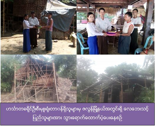 ဇလွန််မြို့နယ်၊ ကူးတို့ဆိပ်ကျေးရွာအုပ်စု၊ အေးရွာတွင် (၂၉-၄-၂၀၁၇) နေ့တွင်ဖြစ်ပွားသော လေပြင်းတိုက်ခတ်မှုကြောင့် လူနေအိမ် (၅) လုံးအမိုးလန်ပျက်စီးခဲ့ရာ အမိုးလန်အိမ်ခြေ (၅) လုံးရှိ အိမ်ထောင်စု (၅) စုအတွက် ကယ်ဆယ်ရေးပစ္စည်း (၄) မျိုးနှင့် လေဘေးသင့် လူဦးရေ (၂၀) ဦးအတွက် (၇) ရက်စာ ဆန်ရိက္ခာဖိုး (၄၂၀၀၀)ကျပ် တို့ကို ဟင်္သာတခရိုင်ကယ်ဆယ်ရေးရုံးမှ တာဝန်ရှိသူများမှ (၃၀-၄-၂၀၁၇) နေ့တွင် ဘေးသင့်ပြည်သူများလက်ဝယ်သို့ ကွင်းဆင်းထောက်ပ့ံခဲ့ကြောင်း သတင်းရရှိပါသည်။