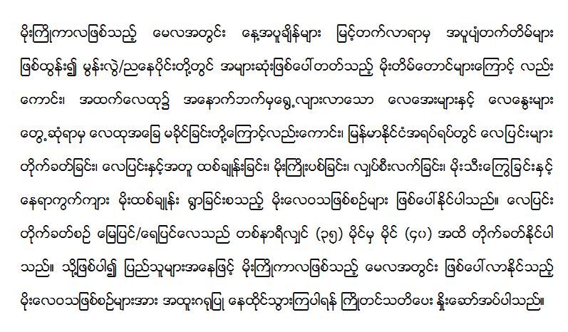 မိုးႀကိဳကာလတြင္ ျဖစ္ေပၚတတ္သည့္ မိုးေလဝသျဖစ္စဥ္မ်ားႏွင့္ပတ္သက္၍ ႀကိဳတင္သတိေပးႏႈိးေဆာ္ခ်က္ အမွတ္စဥ္(၄) ကိုေအာက္ပါအတိုင္းေဖာ္ျပထားပါသည္-