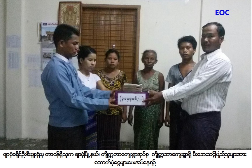 ကယ်ဆယ်ရေးနှင့်ပြန်လည်နေရာချထားရေးဦးစီးဌာန၊ ဖျာပုံခရိုင်ဦးစီးမှူးရုံးမှ တာဝန်ရှိသူများသည် (၂-၅-၂၀၁၇) ရက်နေ့၌ ဖျာပုံမြို့နယ်၊ ကျိုက္ကဘာကျေးရွာအုပ်စု ကျိုက္ကဘာကျေးရွာတွင် ဖြစ်ပွားသော မီးဘေးမှ မီးဘေးသင့် အိမ်ထောင် စု (၃) စုအတွက် ကယ်ဆယ်ရေးပစ္စည်း (၉) မျိုး (၃) အိမ်ထောင်စာ ဘေးသင့်ပြည်သူ (၇) ဦး အတွက် (၇) ရက်စာဆန် ရိက္ခာဘိုး (၁၄၇၀၀ိ/-)ကျပ်နှင့် အိမ်ခြေ (၃) လုံးအတွက် အိမ်ဆောက်ပစ္စည်းဘိုး (၃၀၀၀၀၀/-) ကျပ် စုစုပေါင်း (၃၁၄၇၀၀/-) ကျပ်တိတိအား (၂-၅-၂၀၁၇) ရက်နေ့တွင် ဘေးသင့်ပြည်သူများ လက်ဝယ်သို့ သက်ဆိုင်ရာတာဝန်ရှိသူများ ရှေ့မှောက်တွင် ထောက်ပံ့ပေးအပ်ခဲ့ကြောင်း သတင်းရရှိပါသည်။