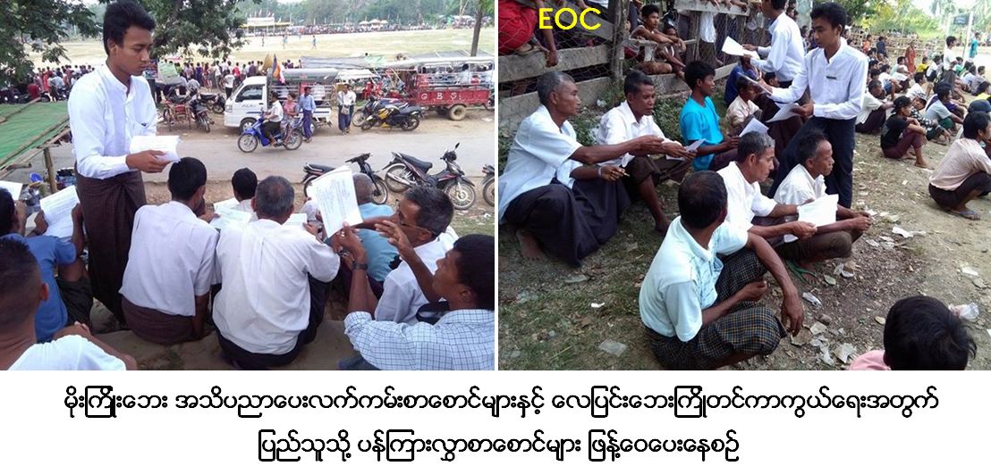 ကယ်ဆယ်ရေးနှင့်ပြန်လည်နေရာချထားရေးဦးစီးဌာန၊ မြောက်ဦးခရိုင်ဦးစီးမှူးရုံးမှ တာဝန်ရှိသူများသည် (၄-၅-၂၀၁၇) ရက်နေ့၌ မြောက်ဦးမြို့၊ သျှစ်သောင်းဘုရားပွဲတွင် ကျင်းပပြုလုပ်သည့် ကျေးရွာပေါင်းစုံဘောလုံးပွဲသို့ လာရောက်အားပေးကြသည့် တိမ်ညိုရွာနှင့် ချောင်းသစ်ရွာများမှ ပြည်သူများအား လေပြင်းဘေးကြိုတင်ပြင်ဆင်ရေးနှင့်စပ်လျဉ်း၍ ပြည်သူသို့ပန်ကြားချက်စာစောင် (၁၀၀) စောင်နှင့် မိုးကြိုးဘေးစာစောင် (၁၀၀) စောင်တို့အား သွားရောက်ဖြန့်ဝေပေးခဲ့ကြောင်း သတင်းရရှိပါသည်။