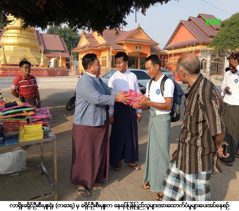 ကယ်ဆယ်ရေးနှင့်ပြန်လည်နေရာချထားရေးဦးစီးဌာန၊ လာရှိုးခရိုင်ဦးစီးမှူးရုံးမှ တာဝန်ရှိသူများသည် (၄-၅-၂၀၁၇) ရက်နေ့တွင် တရုတ်နိုင်ငံအတွင်း အကြောင်းအမျိုးမျိုး ပြစ်ဒက်ကျခံခဲ့ရသော မြန်မာနိုင်ငံသားများအား လောက်ကိုင်မှတဆင့် လားရှိုးမြို့သို့ ရောက်ရှိလာသော လူဦးရေ ကျား (၂၅) ဦး၊ မ (၂) ဦး ပေါင်း (၂၇) ဦးတို့အား မိမိတို့၏နေရပ်ဒေသဖြစ်သော ပဲခူးတိုင်ဒေသကြီး ရေတာရှည်မြို့နယ်၊ သာကရမြို့ ဒေသများပြန်နိုင်ရေးအတွက် (၅ -၅- ၂၀၁၇) ရက်နေ့၊ (၀၉ း၄၅) နာရီတွင် မန္တလေးမြို့သို့ ပို့ဆောင်ခဲ့ပြီး ကယ်ဆယ်ရေးပစ္စည်း (၄) မျိုးနှင့် ဆန် (၇) ရက်စာတို့အား ထောက်ပံ့ပေးခဲ့ကြောင်း သတင်းရရှိပါသည်။