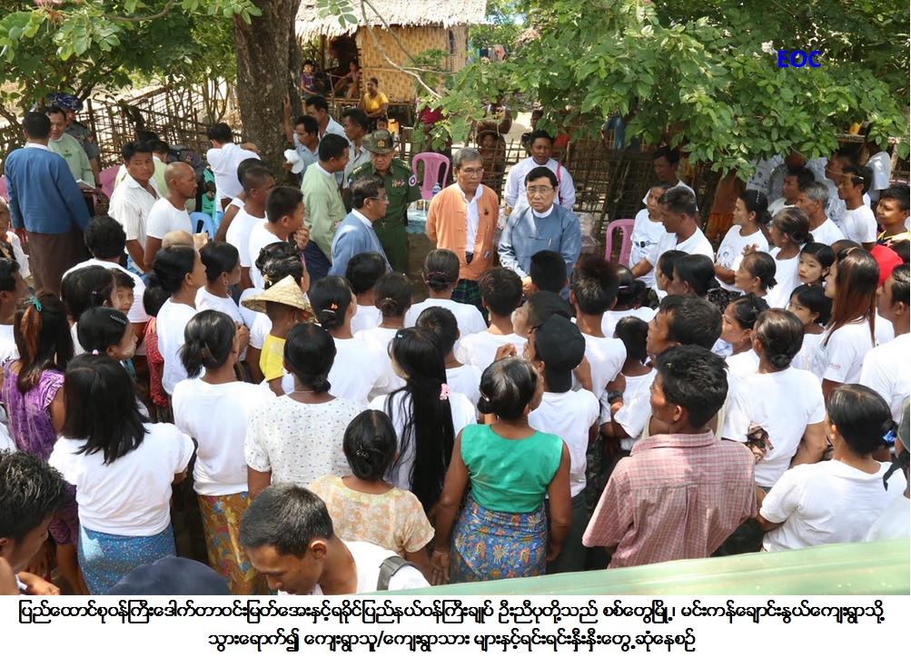 ယင်းနောက် ပြည်ထောင်စုဝန်ကြီးနှင့်ပြည်နယ်ဝန်ကြီးချုပ်တို့သည် စစ်တွေမြို့၊ မင်းကန်ချောင်းနွယ်ကျေးရွာသို့သွားရောက်၍ ကျေးရွာသူ/ကျေးရွာ သား များနှင့်ရင်းရင်းနှီးနှီးတွေ့ဆုံကာ ကျေးရွာဖွံ့ဖြိုးတိုးတက်ရေးအတွက် ကျေးရွာသူကျေးရွာသားများ၏ တင်ပြချက်များဖြစ်သည့် ကျေးရွာရှိလမ်း၊ တံတားများ ကောင်းမွန် ရေး၊ သာမန်အချိန်တွင် စာသင်ကျောင်းအဖြစ် အသုံးပြုပြီး သဘာဝဘေးကျရောက်ချိန်တွင် ခိုလှုံရာအဆောက်အဦးအဖြစ် အသုံးပြုနိုင်မည့် ဘက်စုံသုံးအဆောက်အဦ ဆောက်လုပ်နိုင်ရေးနှင့် အလုပ်အကိုင်အခွင့်အလမ်းများဖန်တီးပေးနိုင်ရေး၊ သဘာဝဘေးကြိုတင် ကာကွယ်ရေးအတွက် ဘေးကျရောက်ပါကအရေးပေါ် အသုံးပြုရန် လိုအပ်သောပစ္စည်းများဖြည့်ဆည်းပေးရေးကိစ္စရပ်များကိုဆွေးနွေးစီမံဆောင်ရွက်ပေးခဲ့ပြီး ကျေးရွာရှိကလေးများအား စားစရာနှင့်ကစားစရာများပေး အပ်ခဲ့ပါကြောင်း သတင်းရရှိပါသည်။