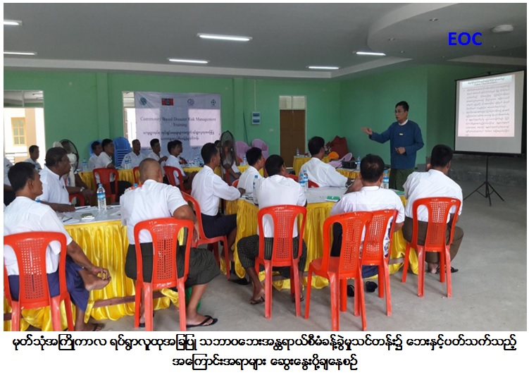 ကယ်ဆယ်ရေးနှင့်ပြန်လည်နေရာချထားရေးဦးစီးဌာန၊ ရခိုင်ပြည်နယ်ဦးစီးမှူးရုံးမှ တာဝန်ရှိသူများသည် (၈-၅-၂၀၁၇) ရက်နေ့တွင် စစ်တွေမြို့နယ် အထွေထွေအုပ်ချုပ်ရေးဦးစီးဌာန ခန်းမ၌ မုတ်သုံအကြိုကာလ ရပ်ရွာလူထုအခြပြု သဘာဝဘေးအန္တရာယ်စီမံခန့်ခွဲမှုသင်တန်းအား ကျင်းပပြုလုပ်ခဲ့ရာ ယင်းသင်တန်းတွင် သင်တန်းသား အင်အား (၃၂) ဦးတက်ရောက်ခဲ့ပြီး သင်တန်းကာလမှာ (၂) ရက်မျှကြာမြင့်မည်ဖြစ်ကြောင်း သတင်းရရှိပါသည်။
