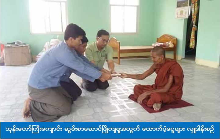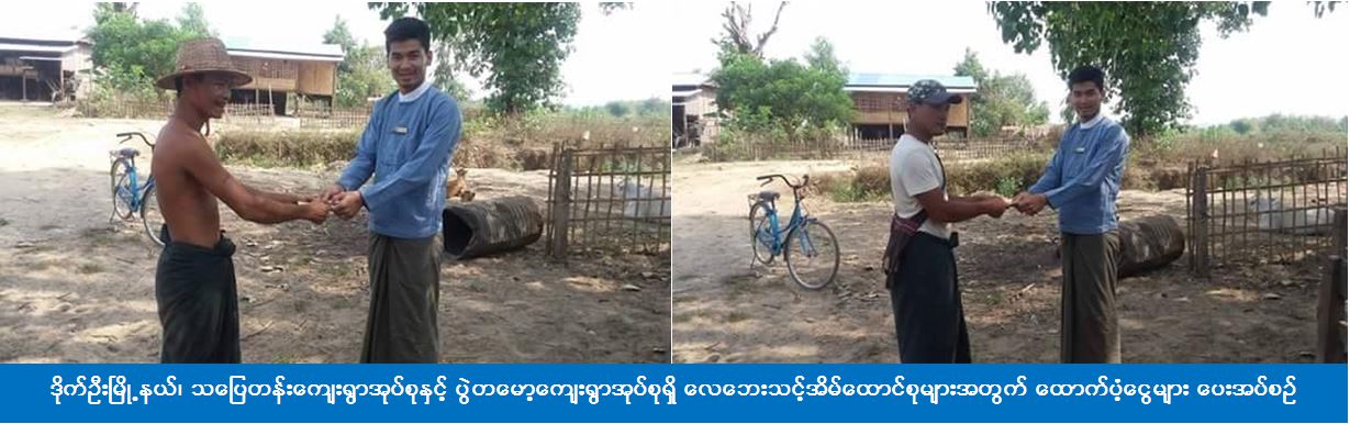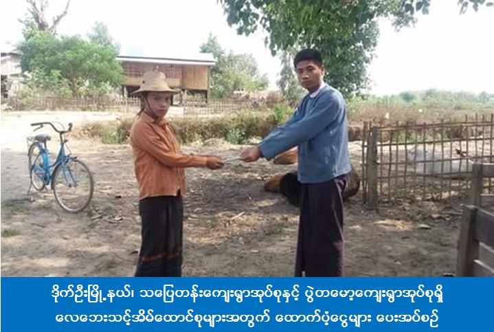 (၅-၅-၂၀၁၇) ရက်နေ့တွင် ပဲခူးတိုင်းဒေသကြီး၊ ပဲခူးခရိုင်၊ ဒိုက်ဦးမြို့နယ်၊ သပြေတန်းကျေးရွာအုပ်စုနှင့် ပွဲတမော့ကျေးရွာအုပ်စုတို့၌ ဖြစ်ပွားခဲ့သော လေဘေးကြောင့် အမိုးလန်ခဲ့သည့် နေအိမ် (၅) လုံးနှင့် ဘုန်းတော်ကြီးကျောင်း ဆွမ်းစာဆောင်ပြိုကျမှုတို့အတွက် ထောက်ပံ့ငွေ (၁၆၀၀၀၀ိ/-) ကျပ်အား ပဲခူးတိုင်းဒေသကြီးဦးစီးမှူးရုံး (ကဆရ) မှ တာဝန်ရှိသူများသည် (၈-၅-၂၀၁၇) ရက်နေ့တွင် ထောက်ပံ့ပေးပြီးဖြစ်ကြောင်း သိရှိရပါသည်။