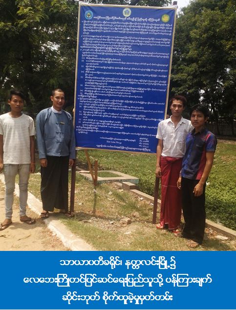 (၉-၅-၂၀၁၇) ရက်နေ့တွင် ပြည်ခရိုင်ဦးစီးမှူးရုံး (ကဆရ) မှ တာဝန်ရှိသူများနှင့် စေတနာပရဟိတလူငယ်များသည် သာယာဝတီခရိုင်၊ နတ္တလင်းမြို့၌ လေဘေးကြိုတင်ပြင်ဆင်ရေး ပြည်သူသို့ ပန်ကြားချက် ဆိုင်းဘုတ်ကို စိုက်ထူခဲ့ကြောင်း သိရှိရပါသည်။