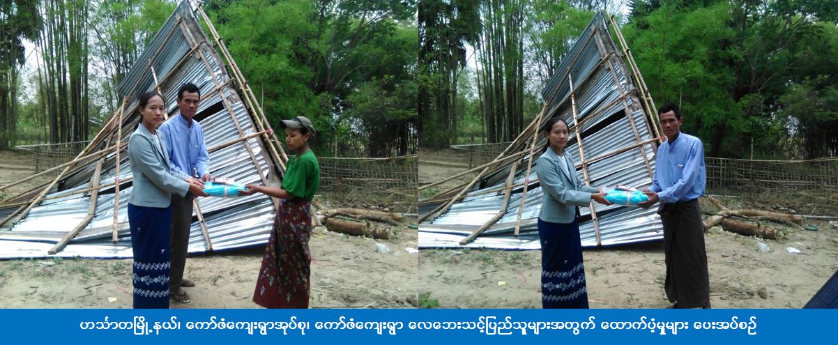 (၉-၅-၂၀၁၇) ရက်နေ့တွင် ဟင်္သာတခရိုင်၊ ဟင်္သာတမြို့နယ်၊ ကော်ဇံကျေးရွာအုပ်စု၊ ကော်ဇံကျေးရွာ၌ လေပြင်းတိုက်ခတ်မှုကြောင့် တစ်စိတ်တစ်ပိုင်းပျက်စီးခဲ့သည့်အိမ်ခြေ (၁) လုံးအတွက် အိမ်ဆောက်ပစ္စည်းဖိုး (၁၀၀၀၀၀) ကျပ်၊ လူဦးရေ (၆) ဦးအတွက် ဆန်(၇)ရက်စာဖိုးငွေ (၁၂၆၀၀) ကျပ်၊ အိမ်ထောင်စု (၁) စုအတွက် ကယ်ဆယ်ရေးပစ္စည်း (၄) မျိုး (၁) အိမ်ထောင်စာ တို့ကို ဟင်္သာတခရိုင်ဦးစီးမှူးရုံး (ကဆရ) မှ တာဝန်ရှိသူများသည် (၁၁-၅-၂၀၁၇) ရက်နေ့တွင် လေဘေးသင့်ပြည်သူများ လက်ဝယ်အရောက် ထောက်ပံ့ခဲ့ကြောင်း သိရှိရပါသည်။