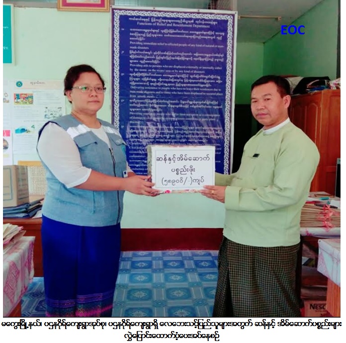 ကယ်ဆယ်ရေးနှင့်ပြန်လည်နေရာချထားရေးဦးစီးဌာန၊ မကွေးတိုင်းဒေသကြီးဦးစီးမှူးရုံးမှ တာဝန်ရှိသူများသည် (၁၄-၅-၂၀၁၇) ရက်နေ့တွင်မကွေးမြို့နယ်၊ ပဌနဂိုရ်ကျေးရွာအုပ်စု၊ ပဌနဂိုရ်ကျေးရွာ၌ လေပြင်းတိုက်ခတ်မှုကြောင့် အိမ်ခြေ (၂) လုံး၊ အိမ်ထောင်စု (၂) စု၊ လူဦးရေ (၉) ဦး အတွက် အိမ်ဆောက်ပစ္စည်းဖိုး (၄၀၀၀၀/-) ကျပ်၊ ဆန်ရိက္ခာဖိုး (၁၈၉၀၀/-) ကျပ်၊ စုစုပေါင်း (၅၈၉၀၀/-) ကျပ်နှင့် ကယ်ဆယ်ရေးပစ္စည်း (၄) မျိုးတို့အား မကွေးမြို့နယ်ဒုတိယမြို့နယ် အုပ်ချုပ်ရေးမှူးထံသို့ (၁၅-၅-၂၀၁၇) ရက်နေ့တွင် လွှဲပြောင်းထောက်ပံ့ပေးခဲ့ကြောင်း သတင်းရရှိပါသည်။