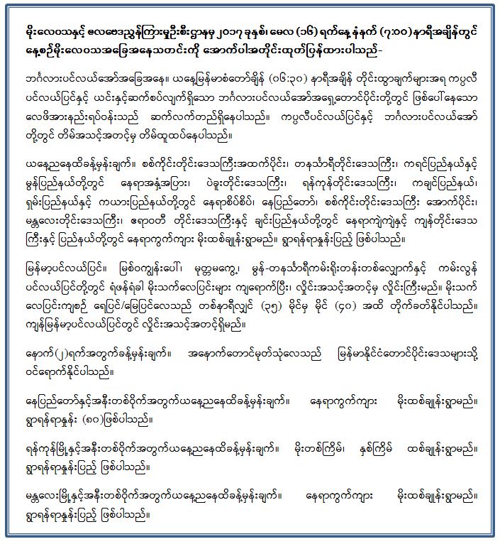 မိုးလေဝသနှင့် ဇလဗေဒညွှန်ကြားမှုဦးစီးဌာနမှ ၂၀၁၇ ခုနှစ်၊ မေလ (၁၆) ရက်နေ့ နံနက် (၇:၀၀) နာရီအချိန်တွင် နေ့စဉ်မိုးလေဝသအခြေအနေသတင်းကို အောက်ပါအတိုင်းထုတ်ပြန်ထားပါသည်-