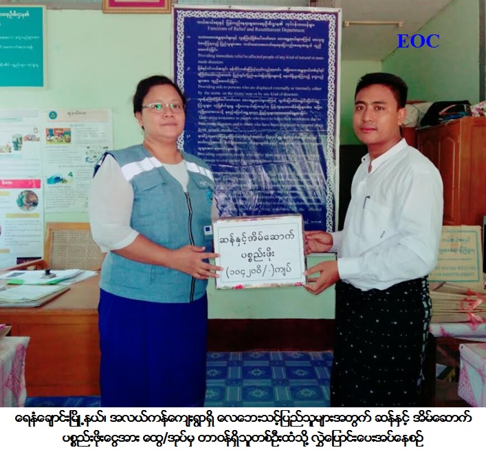 လူမှုဝန်ထမ်း၊ ကယ်ဆယ်ရေးနှင့်ပြန်လည်နေရာချထားရေးဝန်ကြီးဌာန၊ ကယ်ဆယ်ရေးနှင့်ပြန်လည်နေရာချထားရေးဦးစီးဌာန၊ မကွေး တိုင်းဒေသကြီးဦးစီးမှူးရုံးမှ တာဝန်ရှိသူများသည် (၁၁-၅-၂၀၁၇) ရက်နေ့တွင် ဖြစ်ပွားခဲ့သော လေဘေးကြောင့် ရေနံချောင်းမြို့နယ်၊ အလယ်ကန်ကျေးရွာ၌ ပြိုကျအိမ်ခြေ (၁) လုံး၊ လူဦးရေ (၂) ဦးအတွက် ကယ်ဆယ်ရေးပစ္စည်း (၁၆) မျိုး၊ အိမ်ဆောက်ပစ္စည်းဖိုး(၁၀၀၀၀၀/-)၊ ဆန်ရိက္ခာဖိုး (၄၂၀၀/-)၊ စုစုပေါင်း (၁၀၄၂၀၀/-) အား ရေနံချောင်းမြို့နယ် အထွေထွေအုပ်ချုပ်ရေးဦးစီးဌာနမှ တာဝန်ရှိသူတစ်ဦးထံသို့ (၁၅-၅-၂၀၁၇) ရက်နေ့တွင် ထောက်ပံ့ပေးခဲ့ကြောင်း သတင်းရရှိပါသည်။