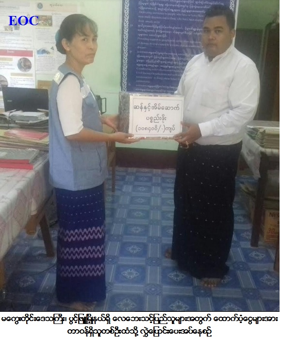 ကယ်ဆယ်ရေးနှင့်ပြန်လည်နေရာချထားရေးဦးစီးဌာန၊ မကွေး တိုင်းဒေသကြီးဦးစီးမှူးရုံးမှ တာဝန်ရှိသူများသည် (၁၁-၅-၂၀၁၇) ရက်နေ့ဖြစ်ပွား ခဲ့သော မင်းဘူးခရိုင်၊ ပွင့်ဖြူမြို့နယ်၊ လယ်မကျေးရွာမှ လေဘေးကြောင့် ပြိုကျလူနေအိမ် (၁) လုံးအတွက် အိမ်ဆောက်ပစ္စည်းဖိုး (၁၀၀၀၀၀/-) ကျပ်၊ လူ (၄) ဦးအတွက် ဆန် (၇) ရက်စာ (၈၄၀၀/-) ကျပ်၊ ကယ်ဆယ်ရေးပစ္စည်း (၁၆) မျိုး အိမ်ထောင်စု (၁) စုစာတို့အား (၁၇-၅-၂၀၁၇) ရက်နေ့၌ ထောက်ပံ့ခဲ့ကြောင်း သတင်းရရှိပါသည်။
