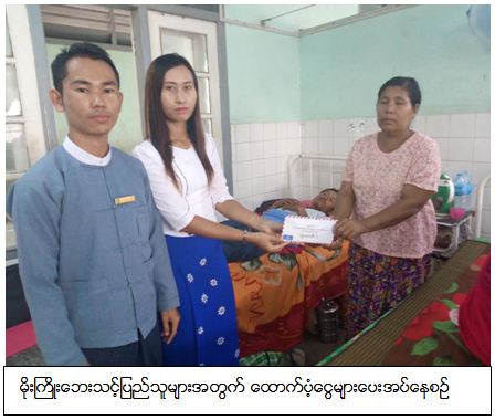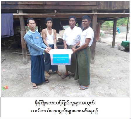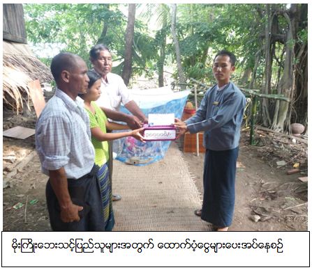 ကယ်ဆယ်ရေးနှင့်ပြန်လည်နေရာချထားရေးဦးစီးဌာန၊ ဧရာဝတီတိုင်းဒေသကြီးဦးစီးမှူးရုံးမှတာဝန်ရှိသူများသည် ပုသိမ်ခရိုင်၊ ကန်ကြီးထောင့်မြို့နယ်၊ အဓလောက်ကျေးရွာအုပ်စု၊ ရေလယ်ကွင်းကျေးရွာတွင် (၁၈-၅-၂၀၁၇) ရက်နေ့၌ ဖြစ်ပွားခဲ့သော မိုးကြိုးဘေးကြောင့် သေဆုံးသူ (၁) ဦးအတွက် ထောက်ပံငွေကျပ် (၃၀၀,၀၀၀ိ/-)၊ ဒဏ်ရာရရှိသူ (၁) ဦး အတွက် ထောက်ပံ့ငွေကျပ် (၅၀,ဝဝဝိ/-)၊ မီးဘေးသင့်နေအိမ် (၁) လုံးအတွက် အိမ်ဆောက်ပစ္စည်းဖိုး (၂၀,ဝဝဝိ/-) ကျပ်နှင့် လူဦးရေ (၈) ဦးအတွက် ဆန်ရိက္ခာ (၇) ရက်စာ (၁၆,၈ဝဝိ/-)ကျပ်၊ စုစုပေါင်း (၃၈၆,၈၀၀ိ/-)ကျပ်တို့အား (၁၉-၅-၂၀၁၇) ရက်နေ့တွင် ကွင်းဆင်းထောက်ပံ့ပေးခဲ့ကြောင်း သတင်းရရှိပါသည်။