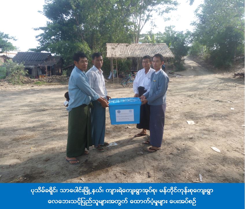 ဧရာဝတီတိုင်းဒေသကြီး၊ ပုသိမ်ခရိုင်၊ သာပေါင်းမြို့နယ်၊ ကျားရဲကျေးရွာအုပ်စု၊ မန်တိုင်ကုန်းစုကျေးရွာ၌ (၁၈-၅-၂၀၁၇) ရက်နေ့တွင် ဖြစ်ပွားခဲ့သော လေဘေးကြောင့် ပြိုကျခဲ့သည့် နေအိမ် (၁) လုံး၊ အိမ်ထောင်စု (၁) စုမှ လူဦးရေ (၈) ဦးအတွက် ကယ်ဆယ်ရေးပစ္စည်း (၂၂) မျိုး (၁)ပုံး၊ အိမ်ဆောက်ပစ္စည်းဖိုး (၁၀၀၀၀၀) ကျပ်၊ ဆန်ရိက္ခာ(၇)ရက်စာ (၁၆၈၀၀) ကျပ်၊ စုစုပေါင်းထောက်ပံ့ငွေ (၁၁၆၈၀၀) ကျပ်အား (၂၀-၅-၂၀၁၇) ရက်နေ့တွင် ဧရာဝတီတိုင်းဒေသကြီးဦးစီးမှူးရုံး (ကဆရ) မှ တာဝန်ရှိသူများသည် ကွင်းဆင်းထောက်ပံ့ခဲ့ကြောင်း သိရှိရပါသည်။