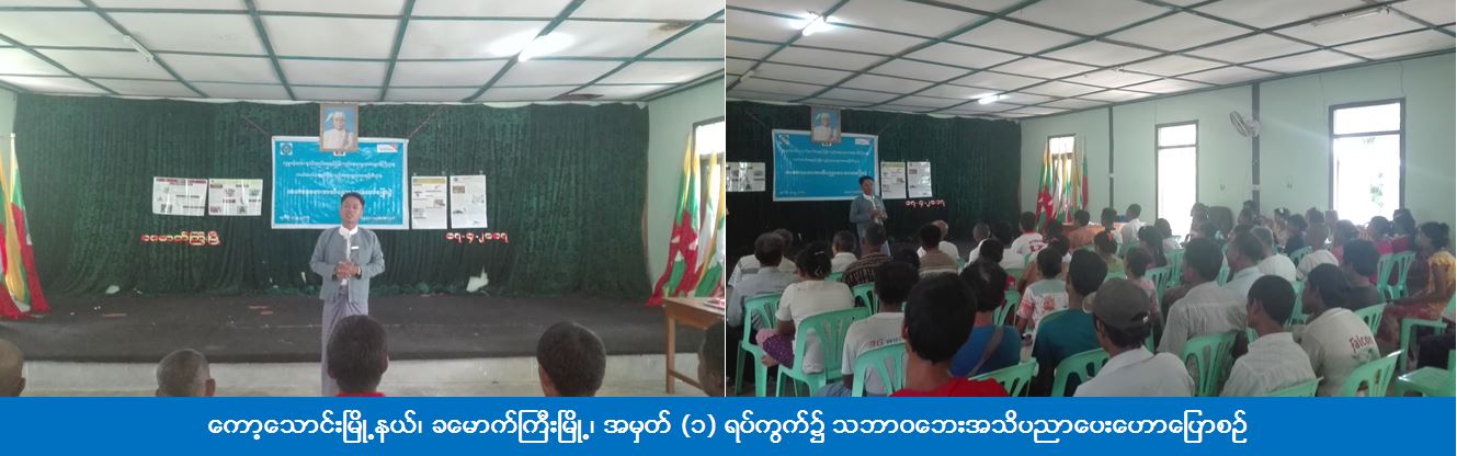 (၃-၅-၂၀၁၇) ရက်နေ့တွင် ကော့သောင်းခရိုင်ဦးစီးမှူးရုံး (ကဆရ) မှ တာဝန်ရှိသူများသည် ကော့သောင်းမြို့နယ်၊ ခမောက်ကြီးမြို့၊ အမှတ် (၁) ရပ်ကွက်၌ သဘာဝဘေးအသိပညာပေး ဟောပြောပွဲ ပြုလုပ်ခဲ့ကြောင်း သိရှိရပါသည်။