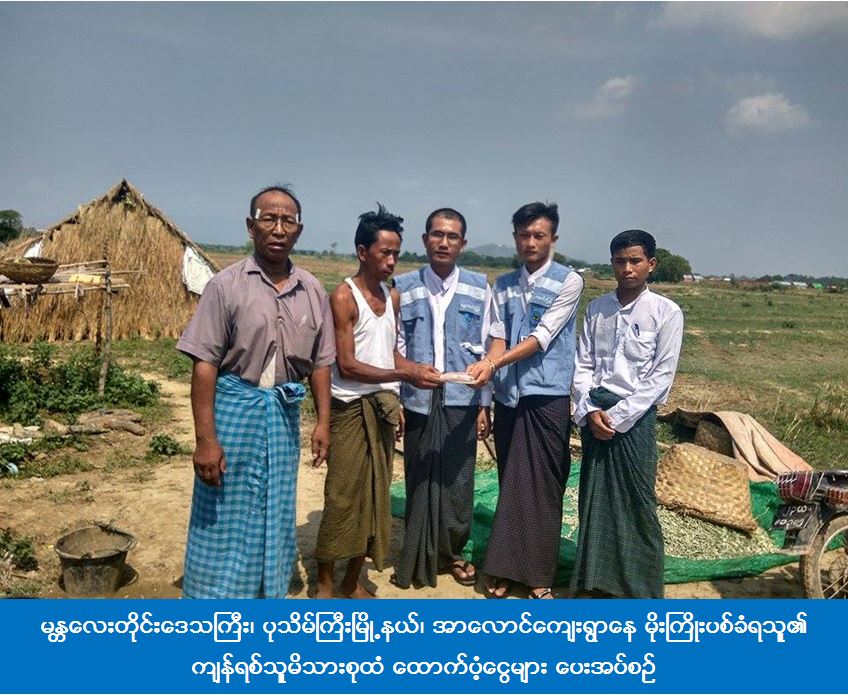 (၁၆-၅-၂၀၁၇) ရက်နေ့တွင် မန္တလေးတိုင်းဒေသကြီးဦးစီးမှူးရုံး (ကဆရ) မှ တာဝန်ရှိသူများသည် ပုသိမ်ကြီးမြို့နယ်၊ အာလောင်ကျေးရွာနေ မိုးကြိုးပစ်ခံရသူ (၁) ဦး၏ ကျန်ရစ်သူမိသားစုထံ ထောက်ပံ့ငွေ (၃) သိန်းကျပ်အား သွားရောက်ထောက်ပံ့ပေးခဲ့ကြောင်း သိရှိရပါသည်။
