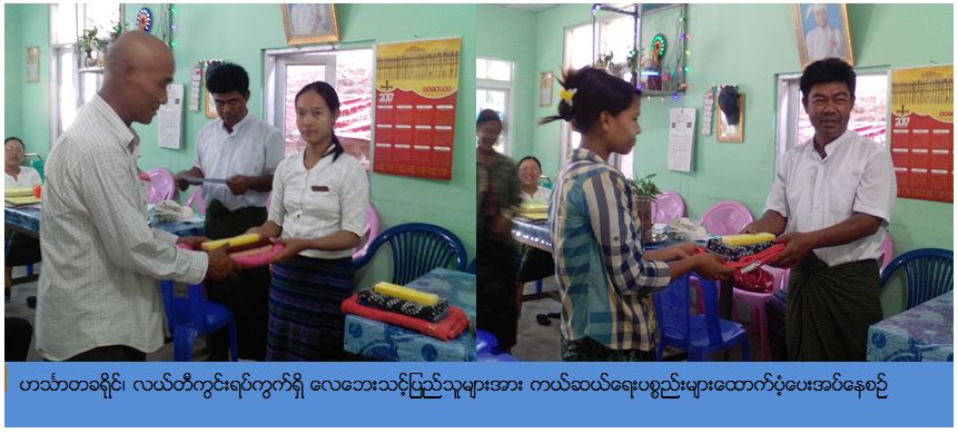 ကယ်ဆယ်ရေးနှင့်ပြန်လည်နေရာချထားရေးဦးစီးဌာန၊ ဟင်္သာတခရိုင်ဦးစီးမှူးရုံးမှတာဝန်ရှိသူများသည် (၂၀-၅-၂၀၁၇)ရက်နေ့တွင် လေပြင်းတိုက်ခတ်မှုကြောင့် လယ်တီကွင်းရပ်ကွက်ရှိ လူနေအိမ် (၁) လုံး ပြိုကျပျက်စီးပြီး လူနေအိမ် (၆) လုံး အမိုးလန်ပျက်စီးမှုများအတွက် ငွေကျပ် (၂၈,၂၁၆/-)တန်ဖိုးရှိ ကယ်ဆယ်ရေးပစ္စည်း (၉) မျိုး အိမ်ထောင်စု (၁) စုစာနှင့် ငွေကျပ် (၄၈,၇၈၀/-) တန်ဖိုးရှိ ကယ်ဆယ်ရေးပစ္စည်း (၄) မျိုး အိမ်ထောင်စု (၆) စုစာ တို့ကို (၂၁-၅-၂၀၁၇) ရက်နေ့တွင် လေဘေးသင့်ပြည်သူများလက်ဝယ်သို့ သွားရောက်ထောက်ပံ့ပေးခဲ့ ကြောင်း သတင်းရရှိပါသည်။