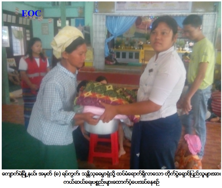 ကယ်ဆယ်ရေးနှင့်ပြန်လည်နေရာချထားရေးဦးစီးဌာန၊ ကျောက်မဲခရိုင်ဦးစီးမှူးရုံးမှ တာဝန်ရှိသူများသည် (၂၂-၅-၂၀၁၇) ရက်နေ့တွင် ကျောက်မဲမြို့နယ်၊ အမှတ် (၈) ရပ်ကွက်၊ သန္တိသုခဓမ္မာရုံသို့ထပ်မံရောက်ရှိလာသော တိုက်ပွဲရှောင်ပြည်သူ အိမ်ထောင်စု (၁၄) စုမှ လူဦးရေ (၅၀) ဦး အတွက် ကယ်ဆယ်ရေးပစ္စည်း (၉) မျိုး (၁၄) စုစာနှင့် လူ (၅၀) ဦးအတွက် ဆန်ရိက္ခာ (၇) ရက်စာ (၁၀၅၀၀၀/-) ကျပ်အား (၂၂-၅-၂၀၁၇) ရက်နေ့တွင် သွားရောက်ထောက်ပံ့ပေးခဲ့ကြောင်း သတင်းရရှိပါသည်။