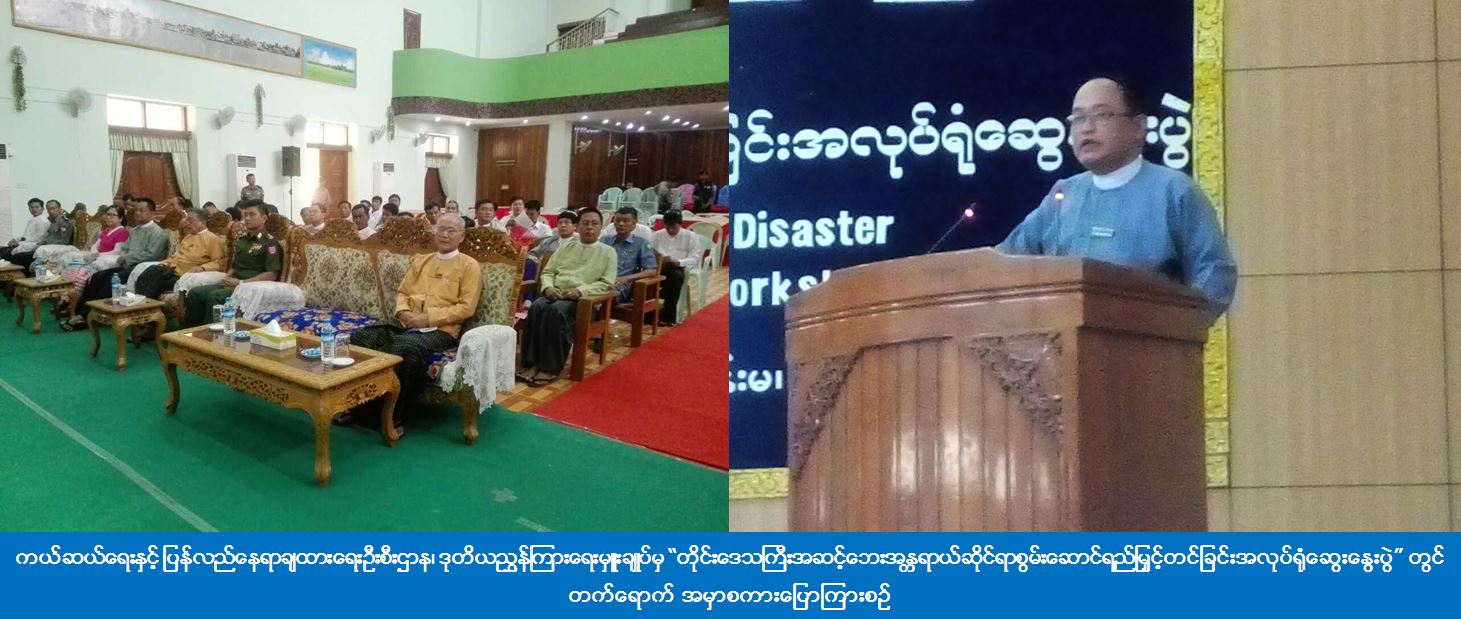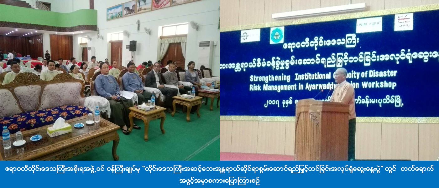 (၂၃-၅-၂၀၁၇) ရက်နေ့တွင် ဧရာဝတီတိုင်းဒေသကြီး၊ ပုသိမ်မြို့ မြို့တော်ခန်းမ၌ “တိုင်းဒေသကြီးအဆင့်ဘေးအန္တရာယ်ဆိုင်ရာ စွမ်းဆောင်ရည်မြှင့်တင်ခြင်းအလုပ်ရုံဆွေးနွေးပွဲ” အား ကျင်းပပြုလုပ်ခဲ့ရာ ဧရာဝတီတိုင်းဒေသကြီးအစိုးရအဖွဲ့ဝင် ဝန်ကြီးချုပ်မှ တက်ရောက်အဖွင့်အမှာစကားပြောကြားပြီး ကယ်ဆယ်ရေးနှင့် ပြန်လည်နေရာချထားရေးဦးစီးဌာန၊ ဒုတိယညွှန်ကြားရေးမှူးချုပ်မှ အမှာစကားပြောကြား၍ အခမ်းအနားအား ဖွင့်လှစ်ခဲ့ပါသည်။ အခမ်းအနားသို့ ဧရာဝတီတိုင်းအစိုးရအဖွဲ့ဝင် ဝန်ကြီးများ၊ တိုင်းအဆင့်ဌာနဆိုင်ရာ ကိုယ်စားလှယ်များ၊ ခရိုင် (၆) မှ ဒုတိယခရိုင်အထွေထွေအုပ်ချုပ်ရေးမှူးများ၊ ကယ်ဆယ်ရေးနှင့် ပြန်လည်နေရာချထားရေးဦးစီးဌာနမှ ခရိုင်ဦးစီးမှူးများ၊ ပြည်တွင်း/ပြည်ပ လူမှုရေးအဖွဲ့အစည်းများနှင့် သက်ဆိုင်ရာအဖွဲ့အစည်းအသီးသီးမှ ကိုယ်စားလှယ်များ တက်ရောက်ခဲ့ကြပါသည်။ အလုပ်ရုံဆွေးနွေးပွဲအား နံနက် (၀၉းဝ၀) နာရီမှ ညနေ (၁၇းဝ၀) နာရီထိ ကျင်းပပြုလုပ်သွားမည်ဖြစ်ကြောင်း သိရှိရပါသည်။