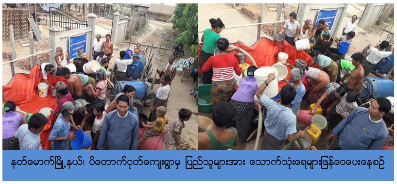ကယ်ဆယ်ရေးနှင့်ပြန်လည်နေရာချထားရေးဦးစီးဌာန၊ မကွေးတိုင်းဒေသကြီးဦးစီးမှူးရုံးမှတာဝန်ရှိ်သူများသည် (၂၃-၅-၂၀၁၇)ရက်နေ့တွင် နတ်မောက်မြို့နယ်၊ ပိတောက်ငုတ်ကျေးရွာမှ အိ်မ်ခြေ (၁၃၅) လုံး၊ လူဦးရေ (၆၇၅) ဦးအတွက် သောက်သုံးရေ ဂါလံ (၈၀၀၀)ကိုဖြန့်ဝေပေးခဲ့ကြောင်းသတင်းရရှိပါသည်။Source: မကွေးတိုင်းဒေသကြီးဦးစီးမှူးရုံး(ကဆရ)
