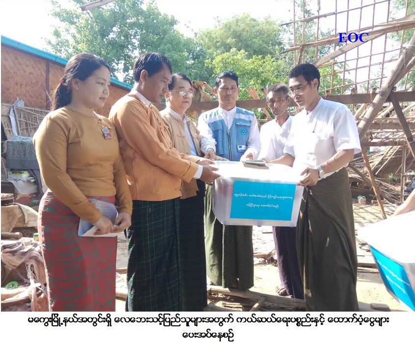 လူမှုဝန်ထမ်း၊ ကယ်ဆယ်ရေးနှင့်ပြန်လည်နေရာချထားရေးဝန်ကြီးဌာန၊ ကယ်ဆယ်ရေးနှင့်ပြန်လည်နေရာချထာရေးဦးစီးဌာန၊ မကွေးတိုင်းဦးစီး မှူးရုံးမှ တာဝန်ရှိသူများသည် (၂၁-၅-၂၀၁၇) ရက်နေ့၌ မကွေးမြို့နယ်၊ ရပ်ကွက် (၅) ကျေးရွာအုပ်စု (၁) စု၌ လေပြင်းတိုက်ခတ်မှုအတွက် အမိုး လန် လူနေအိမ် (၂၇၉) လုံးအတွက် တစ်အိမ်လျှင် (၂၀၀၀၀/-) နှုန်းဖြင့် (၅၅၈၀၀၀၀/-) ကျပ်၊ လုံးဝပြိုကျပျက်စီးလူနေအိမ် (၂၇) လုံးအတွက် တစ်အိမ်လျှင် (၁၀၀၀၀၀/-) ကျပ်နှုန်းဖြင့် (၂၇၀၀၀၀၀/-) ကျပ်၊ လူဦးရေ (၁၂၂၄) ဦးအတွက် ဆန်ဖိုး (၇) ရက်စာ (၂၅၇၀၄၀၀/-) ကျပ် လုံးဝ ပျက်စီးဘုန်းကြီးကျောင်း (၂) ကျောင်းအတွက် (၄၀၀၀၀၀/-) ကျပ် တစ်စိတ်တစ်ပိုင်းပျက်စီး ဘုန်းကြီးကျောင်း (၂) ကျောင်းအတွက် (၂၀၀၀၀၀/-) ကျပ်၊ ကယ်ဆယ်ရေး ပစ္စည်း (၁၆) မျိုး (၂၇) အိမ်ထောင်စုစာတို့ကို တိုင်းဒေသကြီးလူမှုရေးဝန်ကြီး၊ လွှတ်တော်ကိုယ်စားလှယ် များ၊ မြို့နယ်အုပ်ချုပ်ရေးမှူးတို့နှင့်အတူ (၂၂-၅-၂၀၁၇) ရက်နေ့တွင် ကွင်းဆင်းထောက်ပံ့ပေးခဲ့ကြောင်း သတင်းရရှိပါသည်။