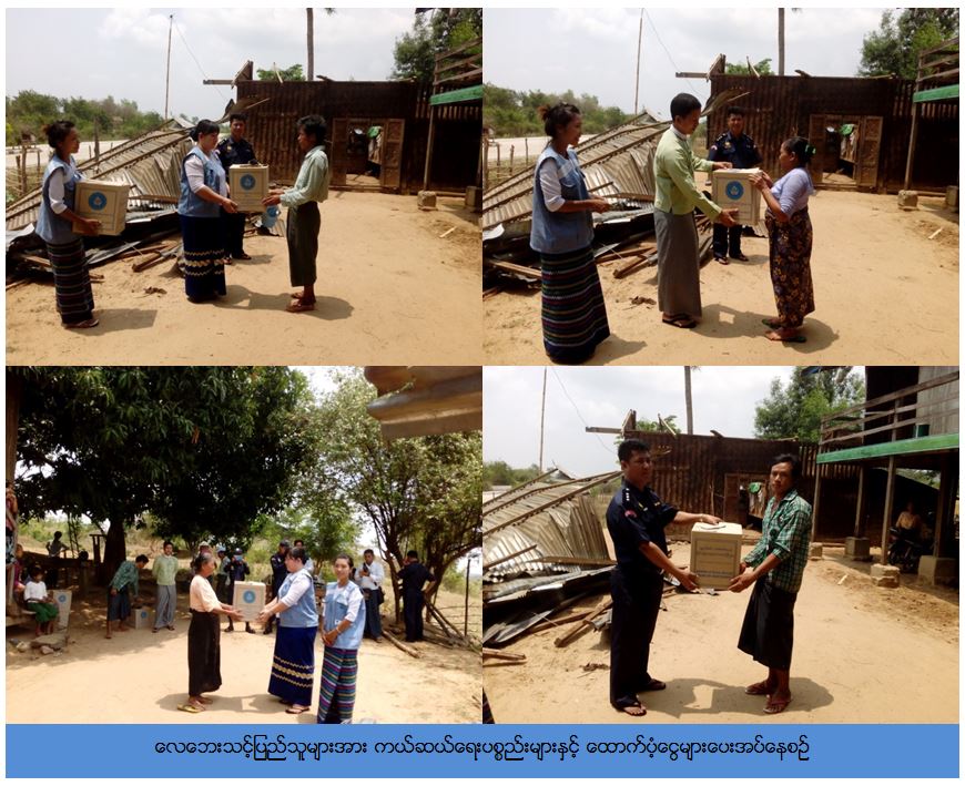 ကယ်ဆယ်ရေးနှင့်ပြန်လည်နေရာချထားရေးဦးစီးဌာန၊ ပြည်ထောင်စုနယ်မြေဦးစီးမှူးရုံးမှတာဝန်ရှိသူများသည် တပ်ကုန်းမြို့၊ ထန်းတောကြီးကျေးရွာအုပ်စု၊ သံခဲတောင်ကျေးရွာတွင် (၂၃-၅-၂၀၁၇) ရက်နေ့၌ ဖြစ်ပွားခဲ့သောလေပြင်းတိုက်ခတ်မှုကြောင့် အမိုးလန်အိမ်ခြေ (၄) လုံး၊ အိမ်ထောင်စု (၄) စုစာ အတွက် ကယ်ဆယ်ရေးပစ္စည်း (၁၀) မျိုး၊ လူဦးရေ (၂၁) ဦးအတွက် ဆန်ရိက္ခာဖိုးထောက်ပံ့ငွေ (၄၄,၁၀၀ိ/-)ကျပ်နှင့် အိမ်ဆောက်ပစ္စည်းဖိုး (၃၄၀,၀၀၀ိ/-)ကျပ်တို့အား (၂၄-၅-၂၀၁၇) ရက်နေ့တွင် သွားရောက်ထောက်ပံ့ ပေးခဲ့ကြောင်း သတင်းရရှိပါသည်။Source: ပြည်ထောင်စုနယ်မြေဦးစီးမှူးရုံး(ကဆရ)