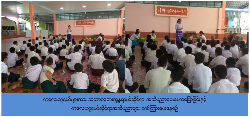 ကယ်ဆယ်ရေးနှင့်ပြန်လည်နေရာချထားရေးဦးစီးဌာန၊ ပြည်ထောင်စုနယ်မြေ၊ နေပြည်တော်ဦးစီးမှူးရုံးမှတာဝန်ရှိသူများသည် (၂၄-၅-၂၀၁၇) နေပြည်တော်လူမှုဝန်ထမ်းဦးစီးဌာနနှင့်ပူးပေါင်း၍ ပျဉ်းမနားမြို့၊ ခေမာသီဝံပရဟိတဂေဟာ သို့သွားရောက်၍ ကလေးသူငယ် (၈၀) ဦးခန့်အား သဘာဝဘေးအန္တရာယ်ဆိုင်ရာ အသိပညာပေးဟောပြောပွဲနှင့် ကလေးသူငယ်ဆိုင်ရာအသိပညာများသင်ကြားပေးခဲ့ပြီး လက်ကမ်းစာစောင်များဖြန့်ဝေခြင်း ကလေးများအတွက် ခေါက်ဆွဲထုပ်များနှင့် အဝတ်အထည်များလှူဒါန်းပေးခဲ့ကြောင်း သတင်းရရှိပါသည်။Source: ပြည်ထောင်စုနယ်မြေ၊ နေပြည်တော်ဦးစီးမှူးရုံး(ကဆရ)