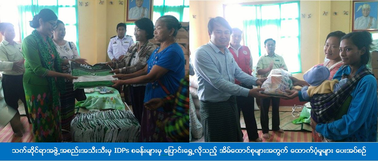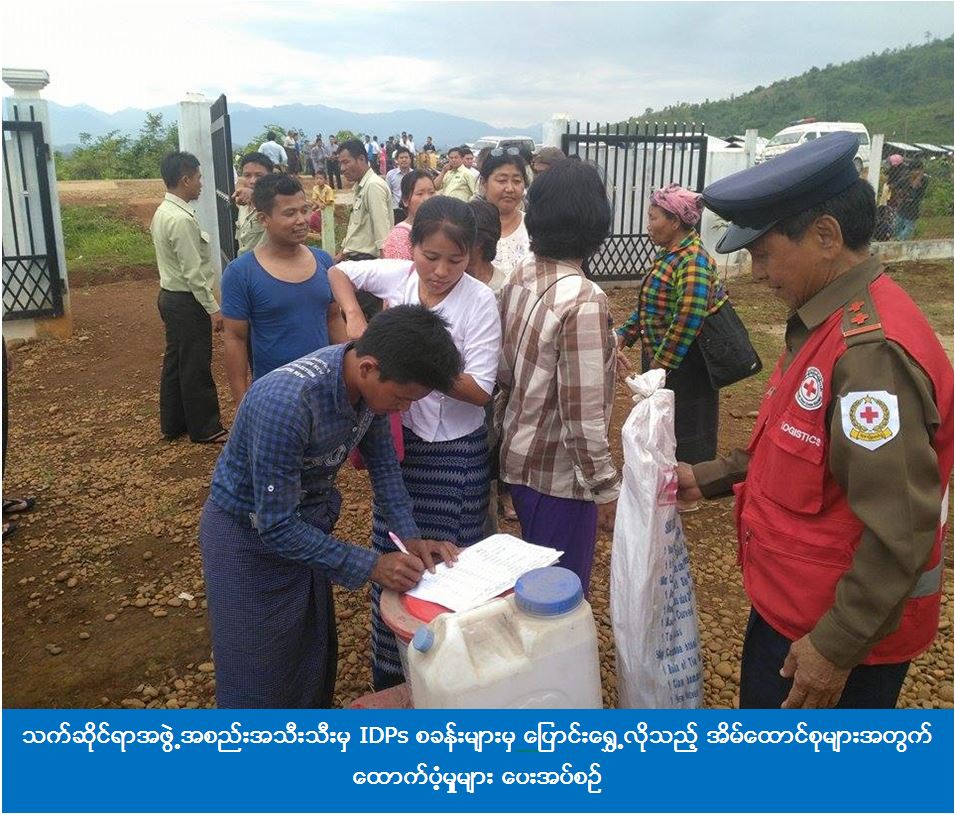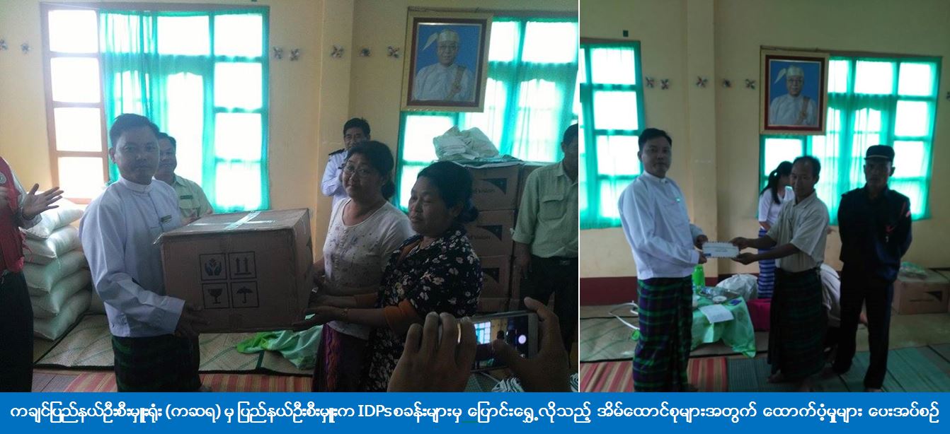 ကချင်ပြည်နယ်အစိုးရအဖွဲနှင့် ကယ်ဆယ်ရေးနှင့် ပြန်လည်နေရာချထားရေးဦးစီးဌာနတို့ ဦးဆောင်၍ မြစ်ကြီးနားနှင့် ဝိုင်းမော်မြို့နယ်ရှိ IDPs စခန်းများမှ ပြောင်းရွှေ့လိုသည့် အိမ်ထောင်စု (၁၇) စုနှင့် လူဦးရေ (၅၉) ဦးအား ပြောင်းရွှေ့နေရာချထားပေးခြင်းအခမ်းအနားကို (၂၉-၅-၂၀၁၇) ရက်နေ့၊ (၀၉းဝ၀) နာရီအချိန်တွင် မြစ်ကြီးနားမြို့၊ ငွေပျော်စံပြကျေးရွာ(ပလန) မူလတန်းကြိုကျောင်း၌ ကျင်းပပြုလုပ်ခဲ့ပါသည်။ အဆိုပါအခမ်းအနားတွင် ကချင်ပြည်နယ် IDPs ရေးရာကော်မတီဝင် လူမှုရေးဝန်ကြီးက အဖွင့်အမှာစကားပြောကြားပြိီး ကချင်ပြည်နယ်အစိုးရအဖွဲ့မှ ထောက်ပံ့သော (၁) အိမ်ထောင်လျှင် ဆန် (၁) အိတ်နှုန်းဖြင့် စုစုပေါင်းဆန် (၁၇) အိတ်ကို ပေးအပ်ခဲ့ပါသည်။ ယင်းနောက် ကယ်ဆယ်ရေးနှင့် ပြန်လည်နေရာချထားရေးဦးစီးဌာနမှ ပစ္စည်း (၃၂) မျိုးပါ Family Kit (၁၇) ပုံးနှင့် လူဦးရေ (၅၉) ဦးအတွက် ဆန်ဖိုးထောက်ပံ့ငွေ (၁၂၃၉၀၀) ကျပ်၊ ပြည်နယ်ကုသရေးဦးစီဌာနမှ ဆေးစိန်ခြင်ထောင် (၅၀) လုံး၊ ပြည်နယ်ကြက်ခြေနီအသင်းမှ family kit (၁၇) ခု၊ ပြည်နယ် IDPs ရေးရာကော်မတီဝင်ဒေါက်တာမောင်မောင်ခန့်က ကွေကာ (၁၇) ထုပ်နှင့် အားဆေး (၁၇) ဗူးတို့ကို ပေးအပ်ခဲ့ပြီး ပြည်နယ်ကျေးလက်ဦးစီးဌာနက ငွေပျော်စံပြကျေးရွာရှိ အိမ်များအား အိမ်ထောင်စုအလိုက် မဲနှိုက် ရွေးချယ်ပေးခဲ့ကြောင်း သိရှိရပါသည်။
