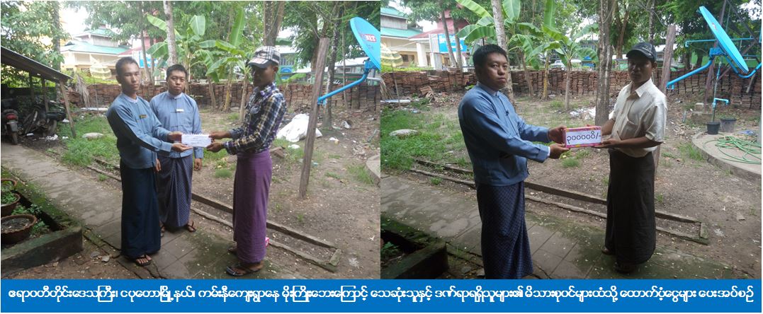 ဧရာဝတီတိုင်းဒေသကြီး၊ ငပုတောမြို့နယ်၊ ကမ်းနီကျေးရွာနေ ဦးမင်းထက်အောင်(ခ) ထက်ထက်(၁၉)နှစ်နှင့် နေမျိုးနိုင်(၂၂)နှစ်တို့သည် ပုသိမ်မြို့မှ ကမ်းနီကျေးရွာသို့ ပြန်စဉ် ပုသိမ်-မော်တင်ကားလမ်း မိုင်တိုင်အမှတ် ၁၆/၆ နှင့် ၁၆/၇ အကြား FP-683540 ကိုင်းချောင်း တံတားအနီးတွင် မိုးရွာသွန်းပြီး မိုးကြိုးပစ်မှုကြောင့် နေမျိုးနိုင်မှာ မိုးကြိုးထိမှန်၍ သေဆုံးခဲ့ပြီး ဦးမင်းထက်အောင်မှာ ဒဏ်ရာရရှိခဲ့သည့်အတွက် (၃၁-၅-၂၀၁၇) ရက်နေ့တွင် သေဆုံးသူ (၁)ဦးအတွက် ထောက်ပံ့ငွေ (၃ဝဝဝဝဝ)ကျပ်နှင့် ထိခိုက်ဒဏ်ရာရရှိသူ (၁) ဦးအတွက် ထောက်ပံ့ငွေ (၅ဝဝဝဝ) ကျပ်၊ စုစုပေါင်း (၃၅၀၀၀၀) ကျပ်တိတိအား ဧရာဝတီတိုင်းဒေသကြီးဦးစီးမှူးရုံး (ကဆရ) မှ တာဝန်ရှိသူများ သည် မိုးကြိုးဘေးကြောင့် သေဆုံးသူနှင့် ဒဏ်ရာရရှိသူများ၏ မိသားစုဝင်များထံသို့ ထောက်ပံ့ပေးအပ်ခဲ့ကြောင်း သိရှိရပါသည်။