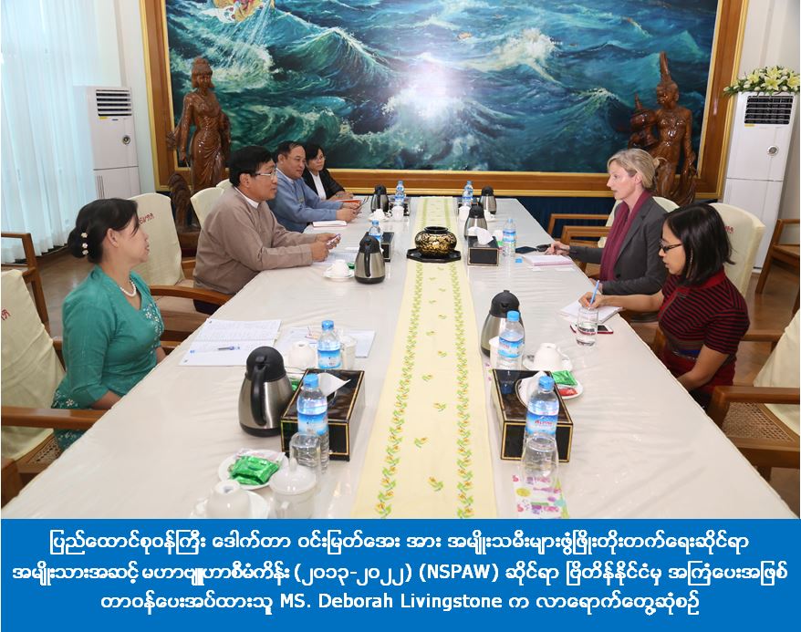 ၁၉၉၇ ခုနှစ်တွင် မြန်မာနိုင်ငံမှ အတည်ပြုလက်မှတ်ရေးထိုးထားသော အမျိုးသမီးများအား နည်းမျိုးစုံဖြင့် ခွဲခြားဆက်ဆံမှုပပျောက်ရေးသဘောတူစာချုပ် (CEDAW) ၏ အခြေခံ သဘောတရားများနှင့် ၁၉၉၅ ခုနှစ်တွင် ချမှတ်ခဲ့သည့် ဘေဂျင်းလုပ်ငန်းစီမံချက်များကို အကောင်အထည်ဖော်နိုင်ရန် လူမှုဝန်ထမ်း၊ ကယ်ဆယ်ရေးနှင့် ပြန်လည်နေရာချထားရေးဝန်ကြီးဌာနသည် အမျိုးသမီးများဖွံ့ဖြိုးတိုးတက်ရေးဆိုင်ရာ အမျိုးသားအဆင့် မဟာဗျူဟာ စီမံကိန်း (၂၀၁၃-၂၀၂၂) (NSPAW) ကို ၂၀၁၃ ခုနှစ်တွင် ထုတ်ပြန်နိုင်ခဲ့ပါသည်။ မဟာဗျူဟာ စီမံကိန်းရှိသော်လည်း အကြောင်းအမျိုးမျိုးကြောင့် အကောင်အထည်ဖေါ်ဆောင်နိုင်မှု အားနည်းခဲ့ရပါသည်။ ယခုအခါတွင် အဆိုပါ မဟာဗျူဟာစီမံချက်ကို အကောင်အထည်ဖော်နိုင်ရေးအတွက် ဗြိတိန်နိုင်ငံမှ လူမှုဝန်ထမ်းဦးစီးဌာနသို့ အကြံပေးအဖြစ် တာဝန်ပေးအပ်ထားသူ Ms.Deborah Livingstone သည် လူမှုဝန်ထမ်း၊ ကယ်ဆယ်ရေးနှင့် ပြန်လည်နေရာချထားရေးဝန်ကြီးဌာန၊ ပြည်ထောင်စုဝန်ကြီး ဒေါက်တာဝင်းမြတ်အေးအား အဆိုပါ ဝန်ကြီးရုံး မေခလာခန်းမတွင် ယနေ့ (၁၄းဝ၀) နာရီအချိန်တွင် လာရောက်တွေ့ဆုံခဲ့ပါသည်။
